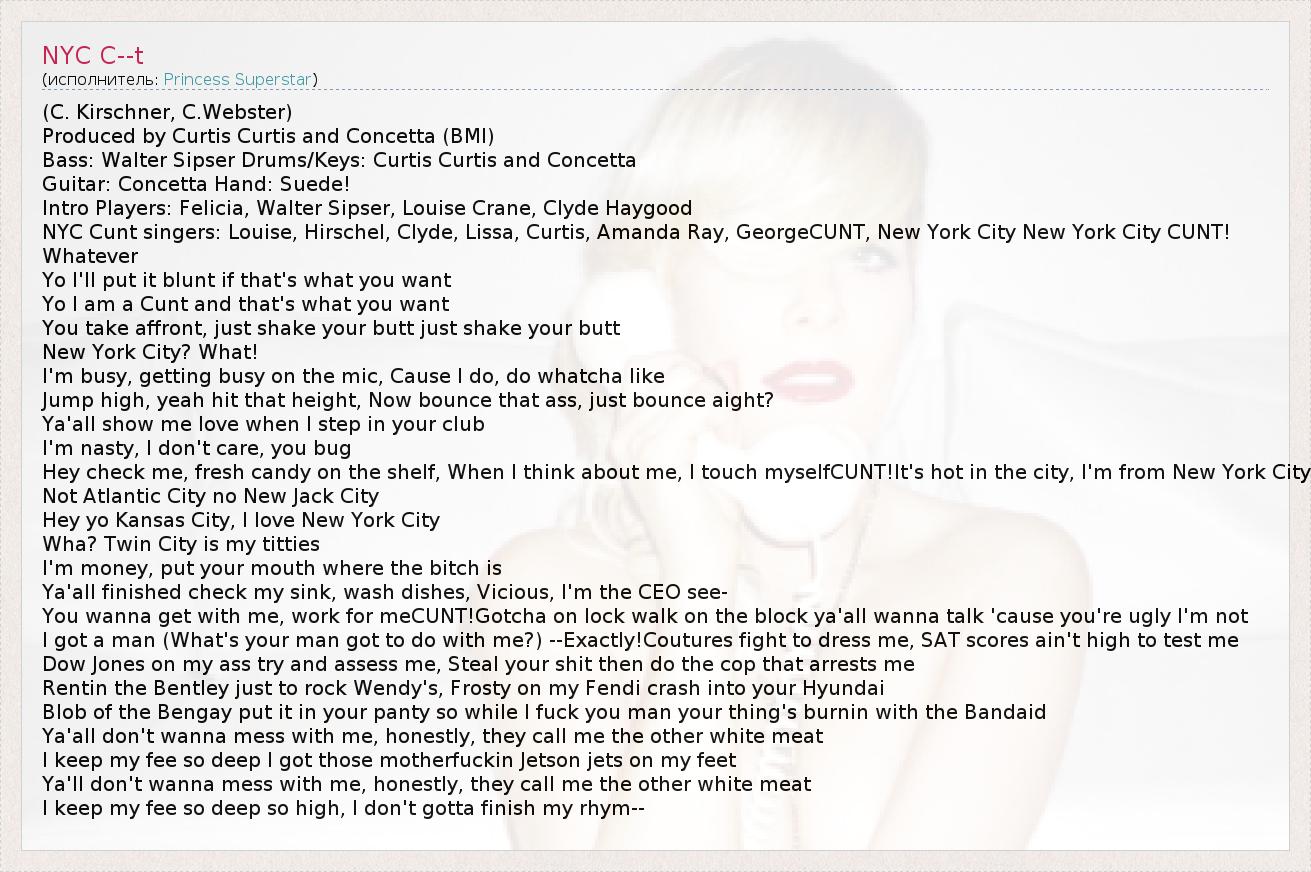 (C. Kirschner, C.Webster) Produced by Curtis Curtis and Concetta (BMI) Bass: Walter Sipser Drums/Keys: Curtis Curtis and Concetta Guitar: Concetta Hand: Suede! Intro Players: Felicia, Walter Sipser, Louise Crane, Clyde Haygood NYC Cunt singers: Louise, Hirschel, Clyde, Lissa, Curtis, Amanda Ray, GeorgeCUNT, New York City New York City CUNT! Whatever Yo I'll put it blunt if that's what you want Yo I am a Cunt and that's what you want You take affront, just shake your butt just shake your butt New York City? What! I'm busy, getting busy on the mic, Cause I do, do whatcha like Jump high, yeah hit that height, Now bounce that ass, just bounce aight? Ya'all show me love when I step in your club I'm nasty, I don't care, you bug Hey check me, fresh candy on the shelf, When I think about me, I touch myselfCUNT!It's hot in the city, I'm from New York City Not Atlantic City no New Jack City Hey yo Kansas City, I love New York City Wha? Twin City is my titties I'm money, put your mouth where the bitch is Ya'all finished check my sink, wash dishes, Vicious, I'm the CEO see- You wanna get with me, work for meCUNT!Gotcha on lock walk on the block ya'all wanna talk 'cause you're ugly I'm not I got a man (What's your man got to do with me?) --Exactly!Coutures fight to dress me, SAT scores ain't high to test me Dow Jones on my ass try and assess me, Steal your shit then do the cop that arrests me Rentin the Bentley just to rock Wendy's, Frosty on my Fendi crash into your Hyundai Blob of the Bengay put it in your panty so while I fuck you man your thing's burnin with the Bandaid Ya'all don't wanna mess with me, honestly, they call me the other white meat I keep my fee so deep I got those motherfuckin Jetson jets on my feet Ya'll don't wanna mess with me, honestly, they call me the other white meat I keep my fee so deep so high, I don't gotta finish my rhym--