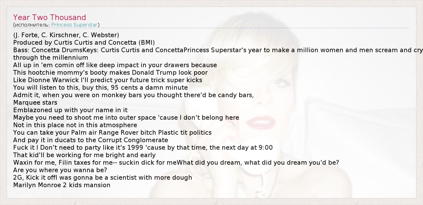 (J. Forte, C. Kirschner, C. Webster) Produced by Curtis Curtis and Concetta (BMI) Bass: Concetta DrumsKeys: Curtis Curtis and ConcettaPrincess Superstar's year to make a million women and men scream and cry through the millennium All up in 'em comin off like deep impact in your drawers because This hootchie mommy's booty makes Donald Trump look poor Like Dionne Warwick I'll predict your future trick super kicks You will listen to this, buy this, 95 cents a damn minute Admit it, when you were on monkey bars you thought there'd be candy bars, Marquee stars Emblazoned up with your name in it Maybe you need to shoot me into outer space 'cause I don't belong here Not in this place not in this atmosphere You can take your Palm air Range Rover bitch Plastic tit politics And pay it in ducats to the Corrupt Conglomerate Fuck it I Don't need to party like it's 1999 'cause by that time, the next day at 9:00 That kid'll be working for me bright and early Waxin for me, Filin taxes for me-- suckin dick for meWhat did you dream, what did you dream you'd be? Are you where you wanna be? 2G, Kick it offI was gonna be a scientist with more dough Marilyn Monroe 2 kids mansion