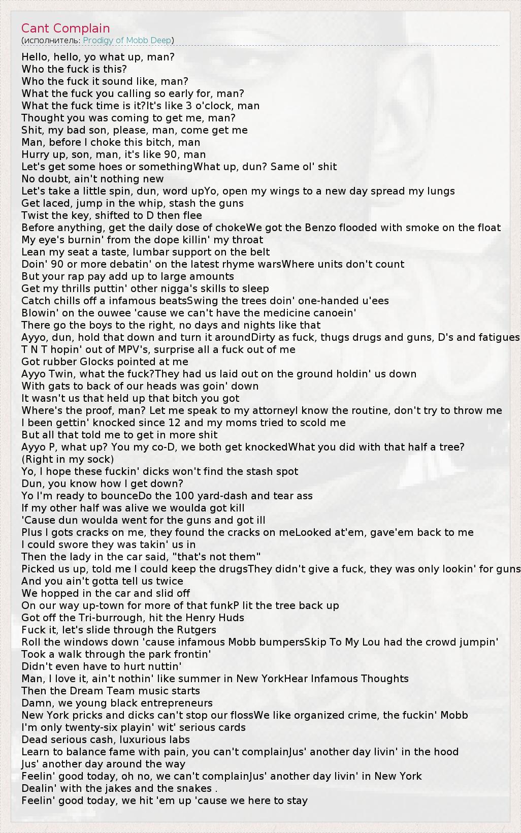 Hello, hello, yo what up, man? Who the fuck is this? Who the fuck it sound like, man? What the fuck you calling so early for, man? What the fuck time is it?It's like 3 o'clock, man Thought you was coming to get me, man? Shit, my bad son, please, man, come get me Man, before I choke this bitch, man Hurry up, son, man, it's like 90, man Let's get some hoes or somethingWhat up, dun? Same ol' shit No doubt, ain't nothing new Let's take a little spin, dun, word upYo, open my wings to a new day spread my lungs Get laced, jump in the whip, stash the guns Twist the key, shifted to D then flee Before anything, get the daily dose of chokeWe got the Benzo flooded with smoke on the float My eye's burnin' from the dope killin' my throat Lean my seat a taste, lumbar support on the belt Doin' 90 or more debatin' on the latest rhyme warsWhere units don't count But your rap pay add up to large amounts Get my thrills puttin' other nigga's skills to sleep Catch chills off a infamous beatsSwing the trees doin' one-handed u'ees Blowin' on the ouwee 'cause we can't have the medicine canoein' There go the boys to the right, no days and nights like that Ayyo, dun, hold that down and turn it aroundDirty as fuck, thugs drugs and guns, D's and fatigues T N T hopin' out of MPV's, surprise all a fuck out of me Got rubber Glocks pointed at me Ayyo Twin, what the fuck?They had us laid out on the ground holdin' us down With gats to back of our heads was goin' down It wasn't us that held up that bitch you got Where's the proof, man? Let me speak to my attorneyI know the routine, don't try to throw me I been gettin' knocked since 12 and my moms tried to scold me But all that told me to get in more shit Ayyo P, what up? You my co-D, we both get knockedWhat you did with that half a tree? (Right in my sock) Yo, I hope these fuckin' dicks won't find the stash spot Dun, you know how I get down? Yo I'm ready to bounceDo the 100 yard-dash and tear ass If my other half was alive we woulda got kill 'Cause dun woulda went for the guns and got ill Plus I gots cracks on me, they found the cracks on meLooked at'em, gave'em back to me I could swore they was takin' us in Then the lady in the car said, "that's not them" Picked us up, told me I could keep the drugsThey didn't give a fuck, they was only lookin' for guns And you ain't gotta tell us twice We hopped in the car and slid off On our way up-town for more of that funkP lit the tree back up Got off the Tri-burrough, hit the Henry Huds Fuck it, let's slide through the Rutgers Roll the windows down 'cause infamous Mobb bumpersSkip To My Lou had the crowd jumpin' Took a walk through the park frontin' Didn't even have to hurt nuttin' Man, I love it, ain't nothin' like summer in New YorkHear Infamous Thoughts Then the Dream Team music starts Damn, we young black entrepreneurs New York pricks and dicks can't stop our flossWe like organized crime, the fuckin' Mobb I'm only twenty-six playin' wit' serious cards Dead serious cash, luxurious labs Learn to balance fame with pain, you can't complainJus' another day livin' in the hood Jus' another day around the way Feelin' good today, oh no, we can't complainJus' another day livin' in New York Dealin' with the jakes and the snakes . Feelin' good today, we hit 'em up 'cause we here to stay