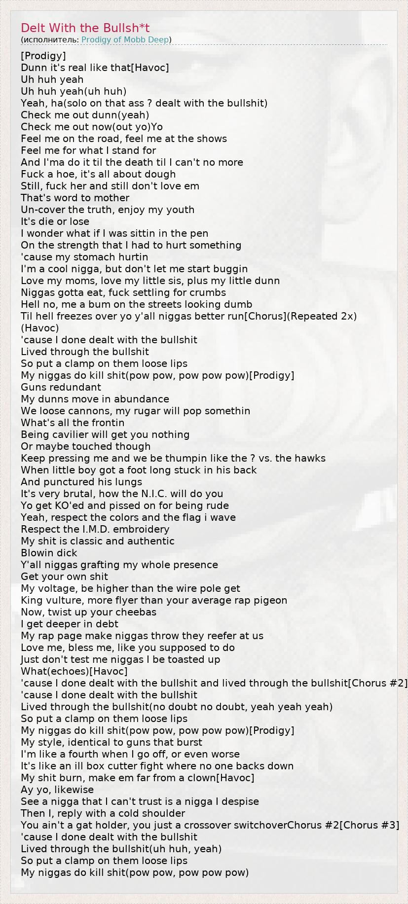 [Prodigy] Dunn it's real like that[Havoc] Uh huh yeah Uh huh yeah(uh huh) Yeah, ha(solo on that ass ? dealt with the bullshit) Check me out dunn(yeah) Check me out now(out yo)Yo Feel me on the road, feel me at the shows Feel me for what I stand for And I'ma do it til the death til I can't no more Fuck a hoe, it's all about dough Still, fuck her and still don't love em That's word to mother Un-cover the truth, enjoy my youth It's die or lose I wonder what if I was sittin in the pen On the strength that I had to hurt something 'cause my stomach hurtin I'm a cool nigga, but don't let me start buggin Love my moms, love my little sis, plus my little dunn Niggas gotta eat, fuck settling for crumbs Hell no, me a bum on the streets looking dumb Til hell freezes over yo y'all niggas better run[Chorus](Repeated 2x) (Havoc) 'cause I done dealt with the bullshit Lived through the bullshit So put a clamp on them loose lips My niggas do kill shit(pow pow, pow pow pow)[Prodigy] Guns redundant My dunns move in abundance We loose cannons, my rugar will pop somethin What's all the frontin Being cavilier will get you nothing Or maybe touched though Keep pressing me and we be thumpin like the ? vs. the hawks When little boy got a foot long stuck in his back And punctured his lungs It's very brutal, how the N.I.C. will do you Yo get KO'ed and pissed on for being rude Yeah, respect the colors and the flag i wave Respect the I.M.D. embroidery My shit is classic and authentic Blowin dick Y'all niggas grafting my whole presence Get your own shit My voltage, be higher than the wire pole get King vulture, more flyer than your average rap pigeon Now, twist up your cheebas I get deeper in debt My rap page make niggas throw they reefer at us Love me, bless me, like you supposed to do Just don't test me niggas I be toasted up What(echoes)[Havoc] 'cause I done dealt with the bullshit and lived through the bullshit[Chorus #2] 'cause I done dealt with the bullshit Lived through the bullshit(no doubt no doubt, yeah yeah yeah) So put a clamp on them loose lips My niggas do kill shit(pow pow, pow pow pow)[Prodigy] My style, identical to guns that burst I'm like a fourth when I go off, or even worse It's like an ill box cutter fight where no one backs down My shit burn, make em far from a clown[Havoc] Ay yo, likewise See a nigga that I can't trust is a nigga I despise Then I, reply with a cold shoulder You ain't a gat holder, you just a crossover switchoverChorus #2[Chorus #3] 'cause I done dealt with the bullshit Lived through the bullshit(uh huh, yeah) So put a clamp on them loose lips My niggas do kill shit(pow pow, pow pow pow)