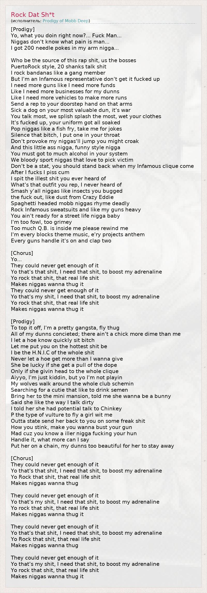 [Prodigy] Yo, what you doin right now?... Fuck Man... Niggas don't know what pain is man... I got 200 needle pokes in my arm nigga... Who be the source of this rap shit, us the bosses PuertoRock style, 20 shanks talk shit I rock bandanas like a gang member But I'm an Infamous representative don't get it fucked up I need more guns like I need more funds Like I need more businesses for my dunns Like I need more vehicles to make more runs Send a rep to your doorstep hand on that arms Sick a dog on your most valuable dun, it's war You talk most, we splish splash the most, wet your clothes It's fucked up, your uniform got all soaked Pop niggas like a fish fry, take me for jokes Silence that bitch, I put one in your throat Don't provoke my niggas'll jump you might croak And this little ass nigga, funny style nigga You must got to much alcohol in your system We bloody sport niggas that love to pick victim Don't be a stat, you should stand back when my Infamous clique come After I fucks I piss cum I spit the illest shit you ever heard of What's that outfit you rep, I never heard of Smash y'all niggas like insects you bugged the fuck out, like dust from Crazy Eddie Spaghetti headed mobb niggas rhyme deadly Rock Infamous sweatsuits and like my guns heavy You ain't ready for a street life nigga baby I'm too fowl, too grimey Too much Q.B. is inside me please rewind me I'm every blocks theme music, e'ry projects anthem Every guns handle it's on and clap two [Chorus] Yo... They could never get enough of it Yo that's that shit, I need that shit, to boost my adrenaline Yo rock that shit, that real life shit Makes niggas wanna thug it They could never get enough of it Yo that's my shit, I need that shit, to boost my adrenaline Yo rock that shit, that real life shit Makes niggas wanna thug it [Prodigy] To top it off, I'm a pretty gangsta, fly thug All of my dunns concieted; there ain't a chick more dime than me I let a hoe know quickly sit bitch Let me put you on the hottest shit be I be the H.N.I.C of the whole shit Never let a hoe get more than I wanna give She be lucky if she get a pull of the dope Only if she givin head to the whole clique Aiyyo, I'm just kiddin, but yo I'm not playin My wolves walk around the whole club schemin Searching for a cutie that like to drink semen Bring her to the mini mansion, told me she wanna be a bunny Said she like the way I talk dirty I told her she had potential talk to Chinkey P the type of vulture to fly a girl wit me Outta state send her back to you on some freak shit How you stink, make you wanna bust your gun Mad cuz you know a iller nigga fucking your hun Handle it, what more can I say Put her on a chain, my dunns too beautiful for her to stay away [Chorus] They could never get enough of it Yo that's that shit, I need that shit, to boost my adrenaline Yo Rock that shit, that real life shit Makes niggas wanna thug They could never get enough of it Yo that's my shit, I need that shit, to boost my adrenaline Yo rock that shit, that real life shit Makes niggas wanna thug it They could never get enough of it Yo that's that shit, I need that shit, to boost my adrenaline Yo Rock that shit, that real life shit Makes niggas wanna thug They could never get enough of it Yo that's my shit, I need that shit, to boost my adrenaline Yo rock that shit, that real life shit Makes niggas wanna thug it