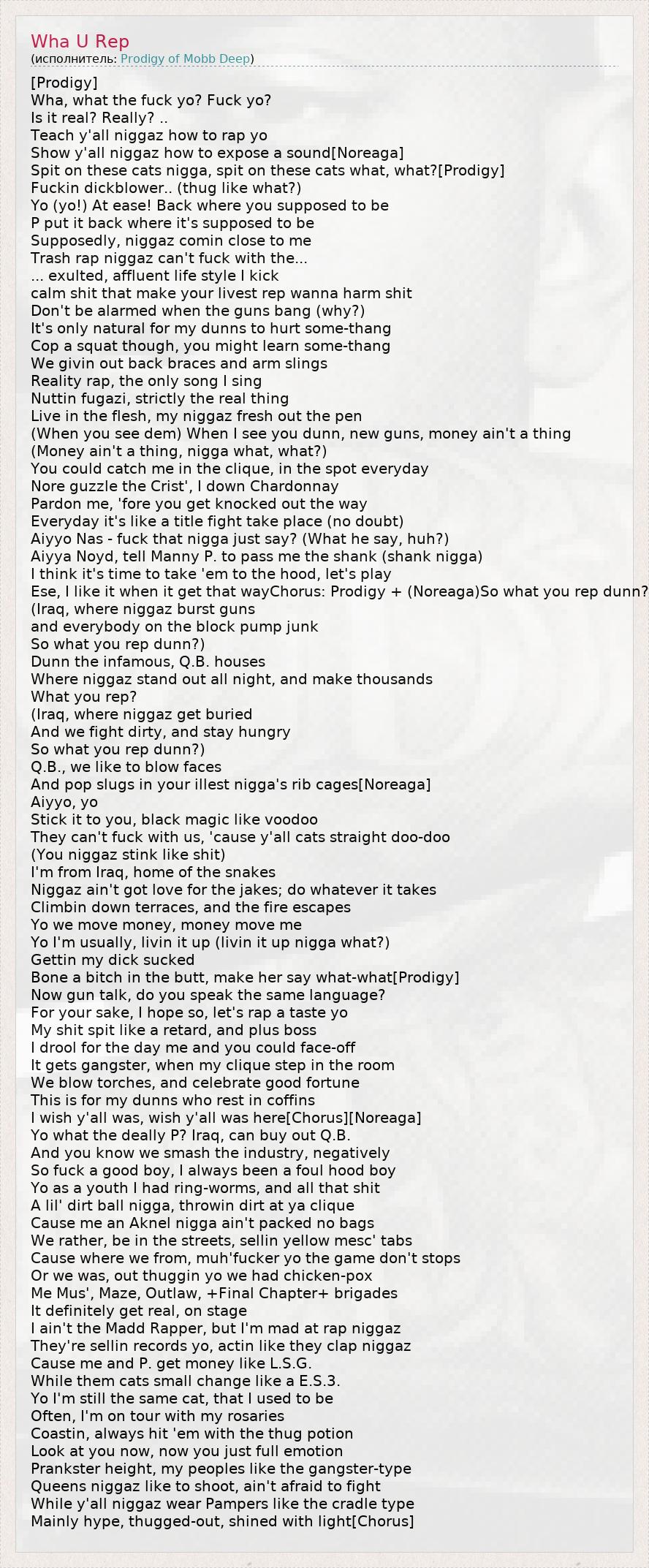 [Prodigy] Wha, what the fuck yo? Fuck yo? Is it real? Really? .. Teach y'all niggaz how to rap yo Show y'all niggaz how to expose a sound[Noreaga] Spit on these cats nigga, spit on these cats what, what?[Prodigy] Fuckin dickblower.. (thug like what?) Yo (yo!) At ease! Back where you supposed to be P put it back where it's supposed to be Supposedly, niggaz comin close to me Trash rap niggaz can't fuck with the... ... exulted, affluent life style I kick calm shit that make your livest rep wanna harm shit Don't be alarmed when the guns bang (why?) It's only natural for my dunns to hurt some-thang Cop a squat though, you might learn some-thang We givin out back braces and arm slings Reality rap, the only song I sing Nuttin fugazi, strictly the real thing Live in the flesh, my niggaz fresh out the pen (When you see dem) When I see you dunn, new guns, money ain't a thing (Money ain't a thing, nigga what, what?) You could catch me in the clique, in the spot everyday Nore guzzle the Crist', I down Chardonnay Pardon me, 'fore you get knocked out the way Everyday it's like a title fight take place (no doubt) Aiyyo Nas - fuck that nigga just say? (What he say, huh?) Aiyya Noyd, tell Manny P. to pass me the shank (shank nigga) I think it's time to take 'em to the hood, let's play Ese, I like it when it get that wayChorus: Prodigy + (Noreaga)So what you rep dunn? (Iraq, where niggaz burst guns and everybody on the block pump junk So what you rep dunn?) Dunn the infamous, Q.B. houses Where niggaz stand out all night, and make thousands What you rep? (Iraq, where niggaz get buried And we fight dirty, and stay hungry So what you rep dunn?) Q.B., we like to blow faces And pop slugs in your illest nigga's rib cages[Noreaga] Aiyyo, yo Stick it to you, black magic like voodoo They can't fuck with us, 'cause y'all cats straight doo-doo (You niggaz stink like shit) I'm from Iraq, home of the snakes Niggaz ain't got love for the jakes; do whatever it takes Climbin down terraces, and the fire escapes Yo we move money, money move me Yo I'm usually, livin it up (livin it up nigga what?) Gettin my dick sucked Bone a bitch in the butt, make her say what-what[Prodigy] Now gun talk, do you speak the same language? For your sake, I hope so, let's rap a taste yo My shit spit like a retard, and plus boss I drool for the day me and you could face-off It gets gangster, when my clique step in the room We blow torches, and celebrate good fortune This is for my dunns who rest in coffins I wish y'all was, wish y'all was here[Chorus][Noreaga] Yo what the deally P? Iraq, can buy out Q.B. And you know we smash the industry, negatively So fuck a good boy, I always been a foul hood boy Yo as a youth I had ring-worms, and all that shit A lil' dirt ball nigga, throwin dirt at ya clique Cause me an Aknel nigga ain't packed no bags We rather, be in the streets, sellin yellow mesc' tabs Cause where we from, muh'fucker yo the game don't stops Or we was, out thuggin yo we had chicken-pox Me Mus', Maze, Outlaw, +Final Chapter+ brigades It definitely get real, on stage I ain't the Madd Rapper, but I'm mad at rap niggaz They're sellin records yo, actin like they clap niggaz Cause me and P. get money like L.S.G. While them cats small change like a E.S.3. Yo I'm still the same cat, that I used to be Often, I'm on tour with my rosaries Coastin, always hit 'em with the thug potion Look at you now, now you just full emotion Prankster height, my peoples like the gangster-type Queens niggaz like to shoot, ain't afraid to fight While y'all niggaz wear Pampers like the cradle type Mainly hype, thugged-out, shined with light[Chorus]