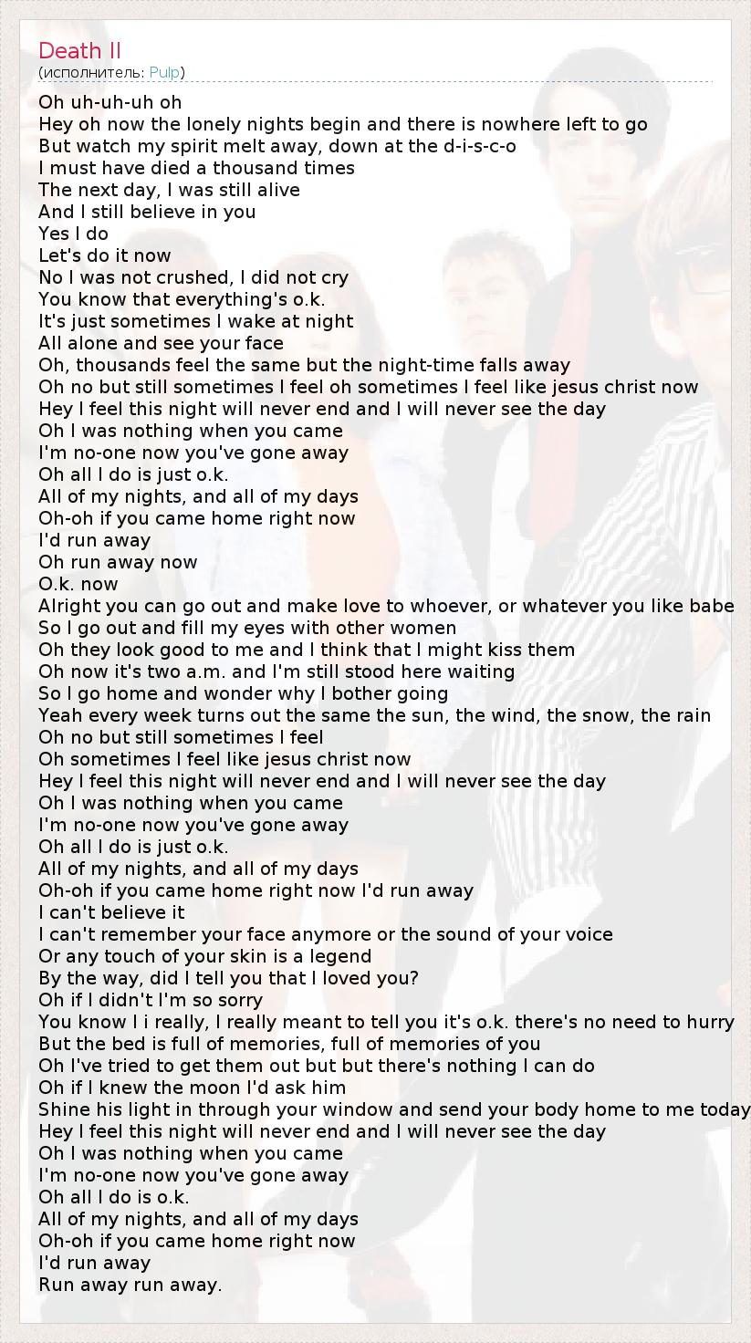 Это интересно:Джарвис Кокер еще в школе основал команду «Arabacus Pulp» в компании со своими одноклассниками Марком Свифтом, Питером Далтоном и Дэвидом Локвудом. Спустя год название группы было сокращено до «Pulp». В течение 1980—1981 годов парни записали свою первую демку, которую представили на суд известному музыкальному критику Джону Пилу. Тому пленка понравилась и он пригласил ребят поучаствовать в своем... продолжение