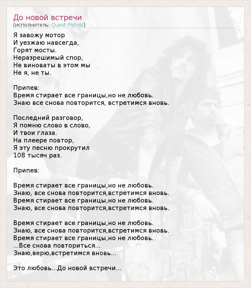 Я завожу мотор И уезжаю навсегда, Горят мосты. Неразрешимый спор, Не виноваты в этом мы Не я, не ты. Припев: Время стирает все границы,но не любовь. Знаю все снова повторится, встретимся вновь. Последний разговор, Я помню слово в слово, И твои глаза. На плеере повтор, Я эту песню прокрутил 108 тысяч раз. Припев: Время стирает все границы,но не любовь. Знаю, все снова повторится,встретимся вновь. Время стирает все границы,но не любовь. Знаю, все снова повторится,встретимся вновь. Время стирает все границы,но не любовь. Знаю, все снова повторится,встретимся вновь. Время стирает все границы,но не любовь. ...Все снова повториться... Знаю,верю,встретимся вновь... Это любовь...До новой встречи...