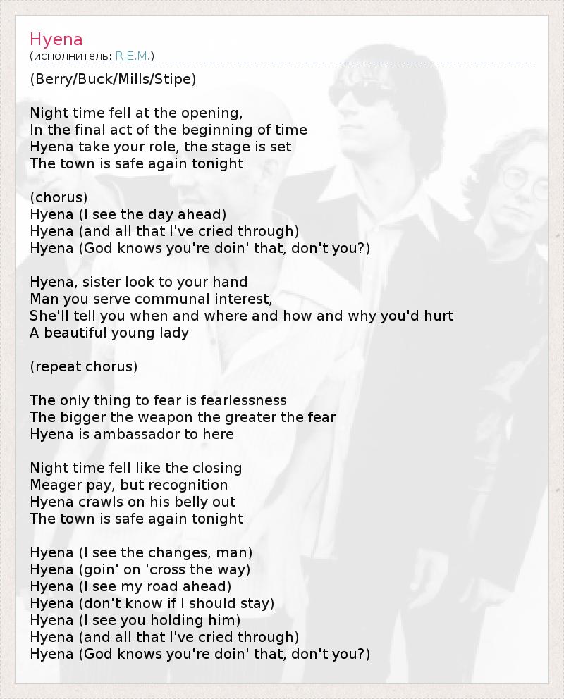 (Berry/Buck/Mills/Stipe) Night time fell at the opening, In the final act of the beginning of time Hyena take your role, the stage is set The town is safe again tonight (chorus) Hyena (I see the day ahead) Hyena (and all that I've cried through) Hyena (God knows you're doin' that, don't you?) Hyena, sister look to your hand Man you serve communal interest, She'll tell you when and where and how and why you'd hurt A beautiful young lady (repeat chorus) The only thing to fear is fearlessness The bigger the weapon the greater the fear Hyena is ambassador to here Night time fell like the closing Meager pay, but recognition Hyena crawls on his belly out The town is safe again tonight Hyena (I see the changes, man) Hyena (goin' on 'cross the way) Hyena (I see my road ahead) Hyena (don't know if I should stay) Hyena (I see you holding him) Hyena (and all that I've cried through) Hyena (God knows you're doin' that, don't you?)