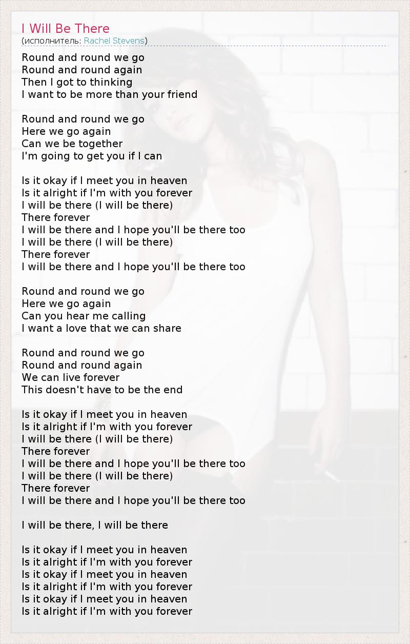 Round and round we go Round and round again Then I got to thinking I want to be more than your friend Round and round we go Here we go again Can we be together I'm going to get you if I can Is it okay if I meet you in heaven Is it alright if I'm with you forever I will be there (I will be there) There forever I will be there and I hope you'll be there too I will be there (I will be there) There forever I will be there and I hope you'll be there too Round and round we go Here we go again Can you hear me calling I want a love that we can share Round and round we go Round and round again We can live forever This doesn't have to be the end Is it okay if I meet you in heaven Is it alright if I'm with you forever I will be there (I will be there) There forever I will be there and I hope you'll be there too I will be there (I will be there) There forever I will be there and I hope you'll be there too I will be there, I will be there Is it okay if I meet you in heaven Is it alright if I'm with you forever Is it okay if I meet you in heaven Is it alright if I'm with you forever Is it okay if I meet you in heaven Is it alright if I'm with you forever