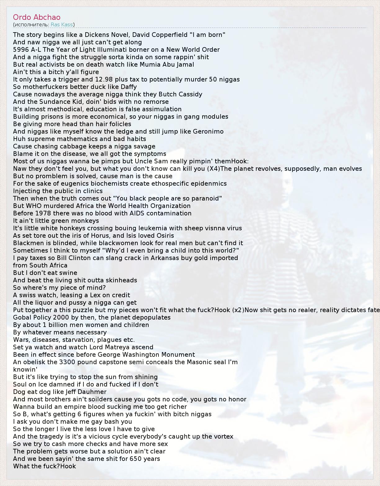 Это интересно:Джон Остин (John Austin) аka Ras Kass — один из немногих избранных афроамериканцев, которые просыпаются, когда им захочется, и которых не беспокоит вопрос, какими путями загрузить желудок, не занимая у братвы. Вот уже третий год Ras Kass ходит в балахонах по последней моде и все именуют его не иначе, как любимым сыном лос–анджелесского рэпперского андерграунда.Если Раким и Тупак — признанные боги... продолжение