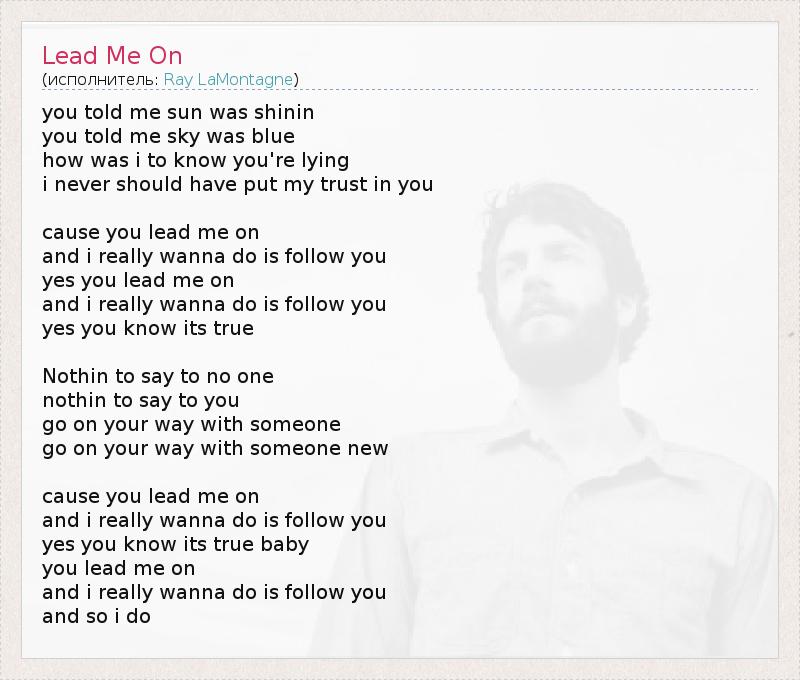 you told me sun was shinin you told me sky was blue how was i to know you're lying i never should have put my trust in you cause you lead me on and i really wanna do is follow you yes you lead me on and i really wanna do is follow you yes you know its true Nothin to say to no one nothin to say to you go on your way with someone go on your way with someone new cause you lead me on and i really wanna do is follow you yes you know its true baby you lead me on and i really wanna do is follow you and so i do