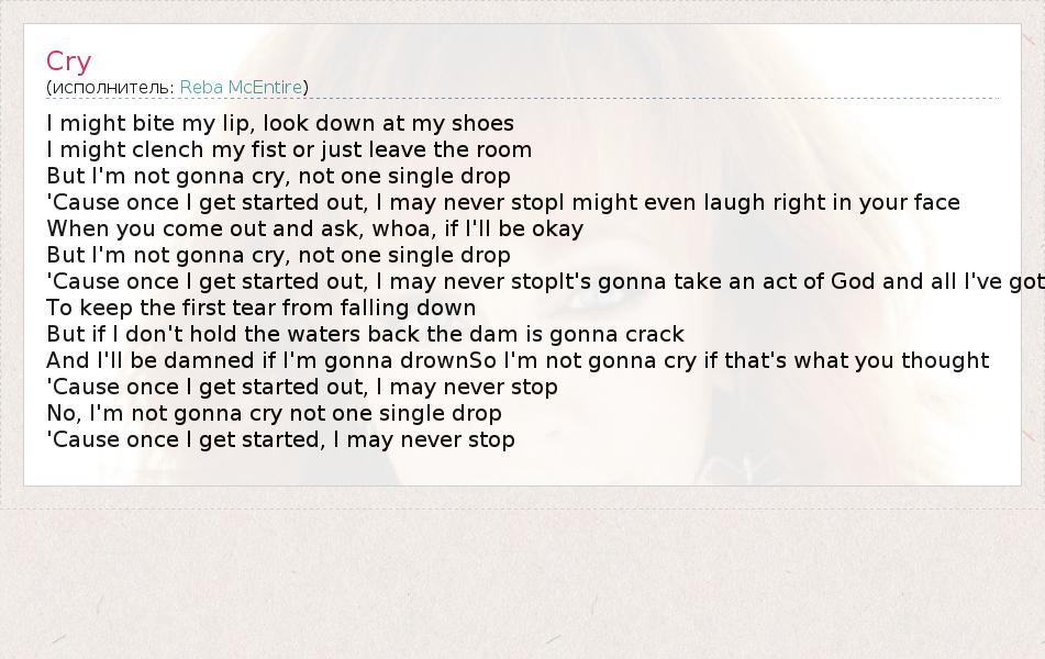 I might bite my lip, look down at my shoes I might clench my fist or just leave the room But I'm not gonna cry, not one single drop 'Cause once I get started out, I may never stopI might even laugh right in your face When you come out and ask, whoa, if I'll be okay But I'm not gonna cry, not one single drop 'Cause once I get started out, I may never stopIt's gonna take an act of God and all I've got To keep the first tear from falling down But if I don't hold the waters back the dam is gonna crack And I'll be damned if I'm gonna drownSo I'm not gonna cry if that's what you thought 'Cause once I get started out, I may never stop No, I'm not gonna cry not one single drop 'Cause once I get started, I may never stop
