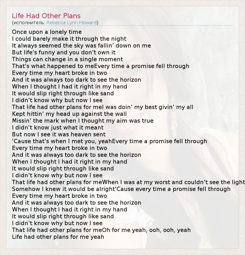 Once upon a lonely time I could barely make it through the night It always seemed the sky was fallin' down on me But life's funny and you don't own it Things can change in a single moment That's what happened to meEvery time a promise fell through Every time my heart broke in two And it was always too dark to see the horizon When I thought I had it right in my hand It would slip right through like sand I didn't know why but now I see That life had other plans for meI was doin' my best givin' my all Kept hittin' my head up against the wall Missin' the mark when I thought my aim was true I didn't know just what it meant But now I see it was heaven sent 'Cause that's when I met you, yeahEvery time a promise fell through Every time my heart broke in two And it was always too dark to see the horizon When I thought I had it right in my hand It would slip right through like sand I didn't know why but now I see That life had other plans for meWhen I was at my worst and couldn't see the light Somehow I knew it would be alright'Cause every time a promise fell through Every time my heart broke in two And it was always too dark to see the horizon When I thought I had it right in my hand It would slip right through like sand I didn't know why but now I see That life had other plans for meOh for me yeah, ooh, ooh, yeah Life had other plans for me yeah