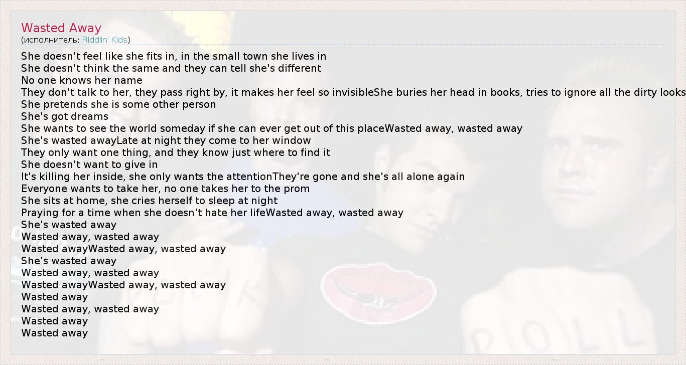 She doesn't feel like she fits in, in the small town she lives in She doesn't think the same and they can tell she's different No one knows her name They don't talk to her, they pass right by, it makes her feel so invisibleShe buries her head in books, tries to ignore all the dirty looks She pretends she is some other person She's got dreams She wants to see the world someday if she can ever get out of this placeWasted away, wasted away She's wasted awayLate at night they come to her window They only want one thing, and they know just where to find it She doesn't want to give in It's killing her inside, she only wants the attentionThey're gone and she's all alone again Everyone wants to take her, no one takes her to the prom She sits at home, she cries herself to sleep at night Praying for a time when she doesn't hate her lifeWasted away, wasted away She's wasted away Wasted away, wasted away Wasted awayWasted away, wasted away She's wasted away Wasted away, wasted away Wasted awayWasted away, wasted away Wasted away Wasted away, wasted away Wasted away Wasted away