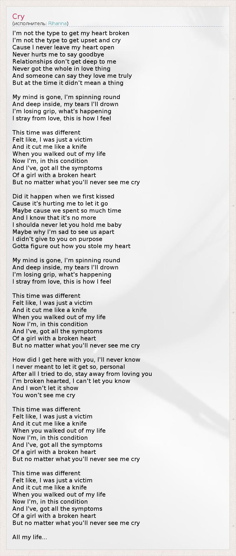 I'm not the type to get my heart broken I'm not the type to get upset and cry Cause I never leave my heart open Never hurts me to say goodbye Relationships don't get deep to me Never got the whole in love thing And someone can say they love me truly But at the time it didn't mean a thing My mind is gone, I'm spinning round And deep inside, my tears I'll drown I'm losing grip, what's happening I stray from love, this is how I feel This time was different Felt like, I was just a victim And it cut me like a knife When you walked out of my life Now I'm, in this condition And I've, got all the symptoms Of a girl with a broken heart But no matter what you'll never see me cry Did it happen when we first kissed Cause it's hurting me to let it go Maybe cause we spent so much time And I know that it's no more I shoulda never let you hold me baby Maybe why I'm sad to see us apart I didn't give to you on purpose Gotta figure out how you stole my heart My mind is gone, I'm spinning round And deep inside, my tears I'll drown I'm losing grip, what's happening I stray from love, this is how I feel This time was different Felt like, I was just a victim And it cut me like a knife When you walked out of my life Now I'm, in this condition And I've, got all the symptoms Of a girl with a broken heart But no matter what you'll never see me cry How did I get here with you, I'll never know I never meant to let it get so, personal After all I tried to do, stay away from loving you I'm broken hearted, I can't let you know And I won't let it show You won't see me cry This time was different Felt like, I was just a victim And it cut me like a knife When you walked out of my life Now I'm, in this condition And I've, got all the symptoms Of a girl with a broken heart But no matter what you'll never see me cry This time was different Felt like, I was just a victim And it cut me like a knife When you walked out of my life Now I'm, in this condition And I've, got all the symptoms Of a girl with a broken heart But no matter what you'll never see me cry All my life...