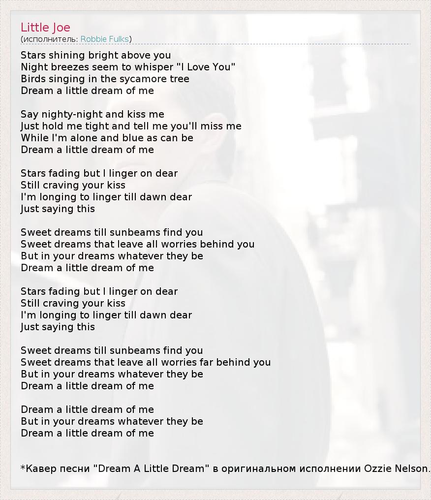 Stars shining bright above you Night breezes seem to whisper "I Love You" Birds singing in the sycamore tree Dream a little dream of me Say nighty-night and kiss me Just hold me tight and tell me you'll miss me While I'm alone and blue as can be Dream a little dream of me Stars fading but I linger on dear Still craving your kiss I'm longing to linger till dawn dear Just saying this Sweet dreams till sunbeams find you Sweet dreams that leave all worries behind you But in your dreams whatever they be Dream a little dream of me Stars fading but I linger on dear Still craving your kiss I'm longing to linger till dawn dear Just saying this Sweet dreams till sunbeams find you Sweet dreams that leave all worries far behind you But in your dreams whatever they be Dream a little dream of me Dream a little dream of me But in your dreams whatever they be Dream a little dream of me *Кавер песни "Dream A Little Dream" в оригинальном исполнении Ozzie Nelson.