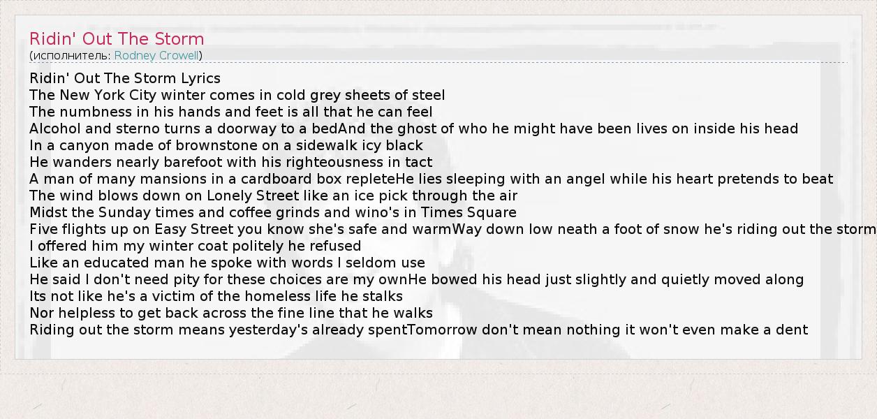 Ridin' Out The Storm Lyrics The New York City winter comes in cold grey sheets of steel The numbness in his hands and feet is all that he can feel Alcohol and sterno turns a doorway to a bedAnd the ghost of who he might have been lives on inside his head In a canyon made of brownstone on a sidewalk icy black He wanders nearly barefoot with his righteousness in tact A man of many mansions in a cardboard box repleteHe lies sleeping with an angel while his heart pretends to beat The wind blows down on Lonely Street like an ice pick through the air Midst the Sunday times and coffee grinds and wino's in Times Square Five flights up on Easy Street you know she's safe and warmWay down low neath a foot of snow he's riding out the storm I offered him my winter coat politely he refused Like an educated man he spoke with words I seldom use He said I don't need pity for these choices are my ownHe bowed his head just slightly and quietly moved along Its not like he's a victim of the homeless life he stalks Nor helpless to get back across the fine line that he walks Riding out the storm means yesterday's already spentTomorrow don't mean nothing it won't even make a dent