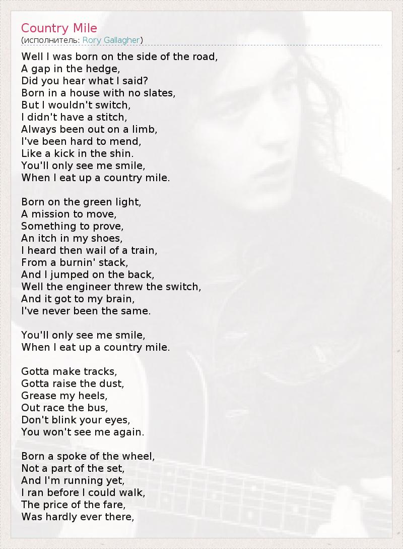 Well I was born on the side of the road, A gap in the hedge, Did you hear what I said? Born in a house with no slates, But I wouldn't switch, I didn't have a stitch, Always been out on a limb, I've been hard to mend, Like a kick in the shin. You'll only see me smile, When I eat up a country mile. Born on the green light, A mission to move, Something to prove, An itch in my shoes, I heard then wail of a train, From a burnin' stack, And I jumped on the back, Well the engineer threw the switch, And it got to my brain, I've never been the same. You'll only see me smile, When I eat up a country mile. Gotta make tracks, Gotta raise the dust, Grease my heels, Out race the bus, Don't blink your eyes, You won't see me again. Born a spoke of the wheel, Not a part of the set, And I'm running yet, I ran before I could walk, The price of the fare, Was hardly ever there,