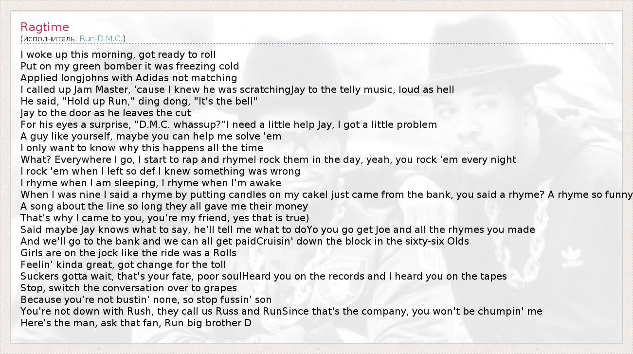 I woke up this morning, got ready to roll Put on my green bomber it was freezing cold Applied longjohns with Adidas not matching I called up Jam Master, 'cause I knew he was scratchingJay to the telly music, loud as hell He said, "Hold up Run," ding dong, "It's the bell" Jay to the door as he leaves the cut For his eyes a surprise, "D.M.C. whassup?"I need a little help Jay, I got a little problem A guy like yourself, maybe you can help me solve 'em I only want to know why this happens all the time What? Everywhere I go, I start to rap and rhymeI rock them in the day, yeah, you rock 'em every night I rock 'em when I left so def I knew something was wrong I rhyme when I am sleeping, I rhyme when I'm awake When I was nine I said a rhyme by putting candles on my cakeI just came from the bank, you said a rhyme? A rhyme so funny A song about the line so long they all gave me their money That's why I came to you, you're my friend, yes that is true) Said maybe Jay knows what to say, he'll tell me what to doYo you go get Joe and all the rhymes you made And we'll go to the bank and we can all get paidCruisin' down the block in the sixty-six Olds Girls are on the jock like the ride was a Rolls Feelin' kinda great, got change for the toll Suckers gotta wait, that's your fate, poor soulHeard you on the records and I heard you on the tapes Stop, switch the conversation over to grapes Because you're not bustin' none, so stop fussin' son You're not down with Rush, they call us Russ and RunSince that's the company, you won't be chumpin' me Here's the man, ask that fan, Run big brother D