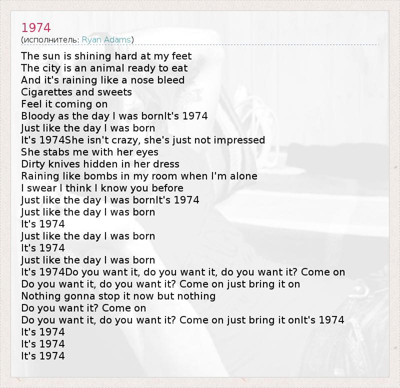 The sun is shining hard at my feet The city is an animal ready to eat And it's raining like a nose bleed Cigarettes and sweets Feel it coming on Bloody as the day I was bornIt's 1974 Just like the day I was born It's 1974She isn't crazy, she's just not impressed She stabs me with her eyes Dirty knives hidden in her dress Raining like bombs in my room when I'm alone I swear I think I know you before Just like the day I was bornIt's 1974 Just like the day I was born It's 1974 Just like the day I was born It's 1974 Just like the day I was born It's 1974Do you want it, do you want it, do you want it? Come on Do you want it, do you want it? Come on just bring it on Nothing gonna stop it now but nothing Do you want it? Come on Do you want it, do you want it? Come on just bring it onIt's 1974 It's 1974 It's 1974 It's 1974