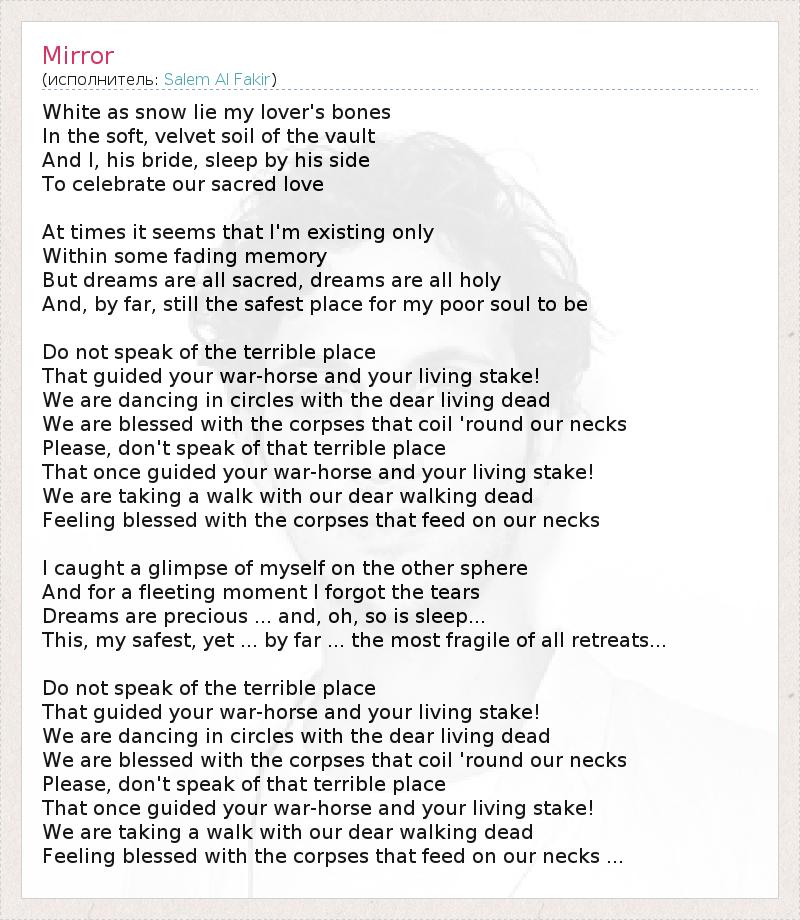 Белые, как снег, кости моего возлюбленного Покоятся в мягкой, бархатистой почве склепа. А я, его невеста, лежу рядом с ним, Воздавая должное нашей священной любви. Порой, кажется, что я существую только В пределах ускользающей памяти. Но мечты священны, мечты все праведны И это, безоговорочно, самое безопаснее место для существования моей бедной души. Не говори об ужасном месте, Что ведет твоего боевого коня и твое существование к сожжению на костре*! Мы водим хороводы с дорогими живыми мертвецами. Мы благословенны телами, что ожерельем висят на наших шеях. Пожалуйста, не говори об этом ужасном месте, Что ведет твоего боевого коня и твое существование к сожжению на костре! Мы гуляем с нашими дорогими зомби, Чувствуя благословение тел, что кормятся на наших шеях. Я мельком увидел(а)** себя в другой сфере, И на миг момент забыл(а) о слезах. Мечты драгоценны...и, о, таков он, сон... Это самое безопасное, без сомнения, самое хрупкое мое пристанище... Не говори об ужасном месте, Что ведет твоего боевого коня и твое существование к сожжению на костре! Мы водим хороводы с дорогими живыми мертвецами. Мы благословенны телами, что ожерельем висят на наших шеях. Пожалуйста, не говори об этом ужасном месте, Что ведет твоего боевого коня и твое существование к сожжению на костре! Мы гуляем с нашими дорогими зомби, Чувствуя благословение тел, что кормятся на наших шеях. * см. песню Stake of my Soul ** чит. биографию Анны Варни о половой самоиденификации http://www.amalgama-forum.com/showthread.php?t=399&p=12699#post12699