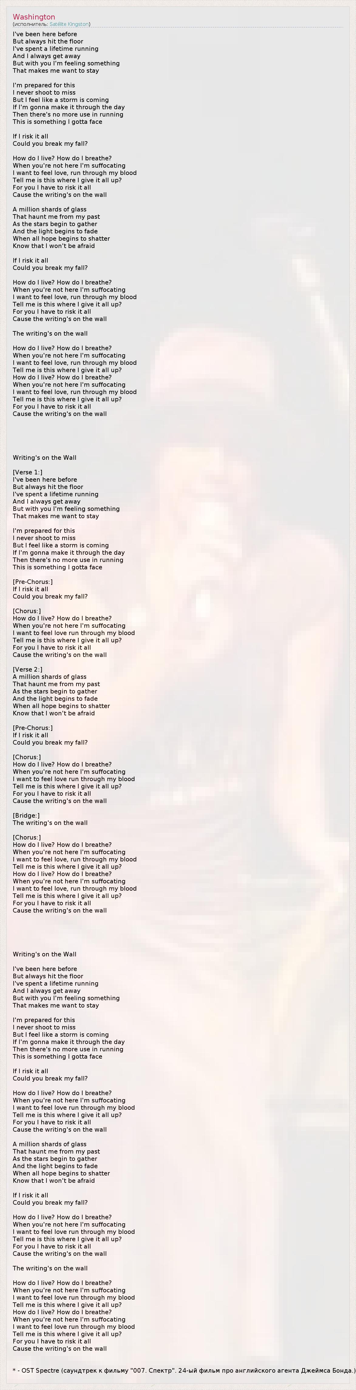 I've been here before But always hit the floor I've spent a lifetime running And I always get away But with you I'm feeling something That makes me want to stay I'm prepared for this I never shoot to miss But I feel like a storm is coming If I'm gonna make it through the day Then there's no more use in running This is something I gotta face If I risk it all Could you break my fall? How do I live? How do I breathe? When you're not here I'm suffocating I want to feel love, run through my blood Tell me is this where I give it all up? For you I have to risk it all Cause the writing's on the wall A million shards of glass That haunt me from my past As the stars begin to gather And the light begins to fade When all hope begins to shatter Know that I won't be afraid If I risk it all Could you break my fall? How do I live? How do I breathe? When you're not here I'm suffocating I want to feel love, run through my blood Tell me is this where I give it all up? For you I have to risk it all Cause the writing's on the wall The writing's on the wall How do I live? How do I breathe? When you're not here I'm suffocating I want to feel love, run through my blood Tell me is this where I give it all up? How do I live? How do I breathe? When you're not here I'm suffocating I want to feel love, run through my blood Tell me is this where I give it all up? For you I have to risk it all Cause the writing's on the wall Writing's on the Wall [Verse 1:] I've been here before But always hit the floor I've spent a lifetime running And I always get away But with you I'm feeling something That makes me want to stay I'm prepared for this I never shoot to miss But I feel like a storm is coming If I'm gonna make it through the day Then there's no more use in running This is something I gotta face [Pre-Chorus:] If I risk it all Could you break my fall? [Chorus:] How do I live? How do I breathe? When you're not here I'm suffocating I want to feel love run through my blood Tell me is this where I give it all up? For you I have to risk it all Cause the writing's on the wall [Verse 2:] A million shards of glass That haunt me from my past As the stars begin to gather And the light begins to fade When all hope begins to shatter Know that I won't be afraid [Pre-Chorus:] If I risk it all Could you break my fall? [Chorus:] How do I live? How do I breathe? When you're not here I'm suffocating I want to feel love run through my blood Tell me is this where I give it all up? For you I have to risk it all Cause the writing's on the wall [Bridge:] The writing's on the wall [Chorus:] How do I live? How do I breathe? When you're not here I'm suffocating I want to feel love, run through my blood Tell me is this where I give it all up? How do I live? How do I breathe? When you're not here I'm suffocating I want to feel love, run through my blood Tell me is this where I give it all up? For you I have to risk it all Cause the writing's on the wall Writing's on the Wall I've been here before But always hit the floor I've spent a lifetime running And I always get away But with you I'm feeling something That makes me want to stay I'm prepared for this I never shoot to miss But I feel like a storm is coming If I'm gonna make it through the day Then there's no more use in running This is something I gotta face If I risk it all Could you break my fall? How do I live? How do I breathe? When you're not here I'm suffocating I want to feel love run through my blood Tell me is this where I give it all up? For you I have to risk it all Cause the writing's on the wall A million shards of glass That haunt me from my past As the stars begin to gather And the light begins to fade When all hope begins to shatter Know that I won't be afraid If I risk it all Could you break my fall? How do I live? How do I breathe? When you're not here I'm suffocating I want to feel love run through my blood Tell me is this where I give it all up? For you I have to risk it all Cause the writing's on the wall The writing's on the wall How do I live? How do I breathe? When you're not here I'm suffocating I want to feel love run through my blood Tell me is this where I give it all up? How do I live? How do I breathe? When you're not here I'm suffocating I want to feel love run through my blood Tell me is this where I give it all up? For you I have to risk it all Cause the writing's on the wall * - OST Spectre (саундтрек к фильму "007. Спектр". 24-ый фильм про английского агента Джеймса Бонда.)