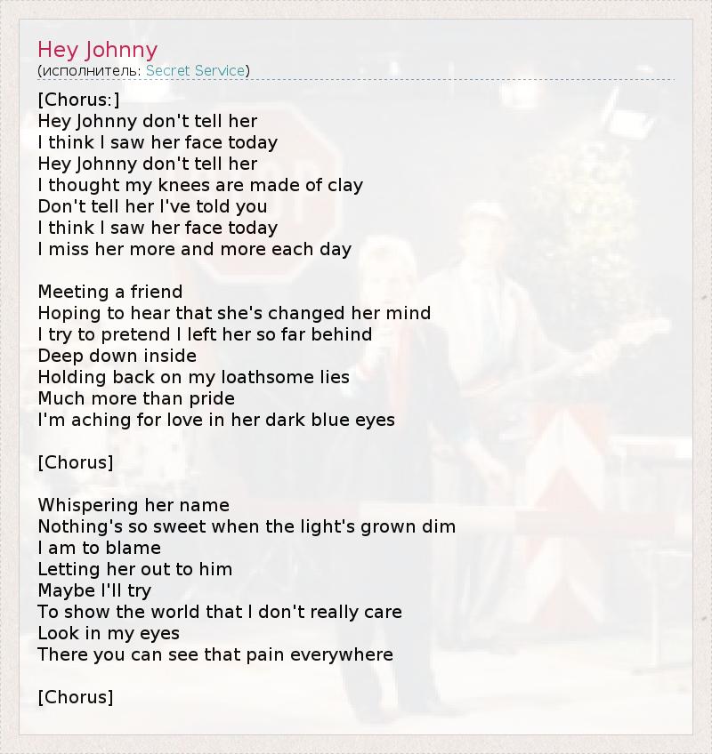 [Припев:] Эй, Джонни, не говори ей, Думаю, я видел её сегодня. Эй, Джонни, не говори ей, Я думал, что не смогу сдвинуться с места*. Не рассказывай ей того, что я сказал тебе, Думаю, я видел её сегодня. Я скучаю по ней с каждым днём всё сильнее. Встретив друга, Надеюсь услышать, что она изменила своё мнение. Я пытаюсь делать вид, что она в прошлом, В глубинах души. Я сдерживаю ужасную ложь, Это большее, чем гордость. Я хочу увидеть в её тёмно-синих глазах любовь. [Припев] Шепчу её имя, Нет ничего более приятного, когда свет исчезает вдали. Я виню себя, В том, что отпустил её к нему. Возможно, я попытаюсь Показать всему миру, что мне всё равно. Посмотри в мои глаза – В них только боль. [Припев] *досл.- мои колени сделаны из глины (русский аналог: "ноги сделались ватными")