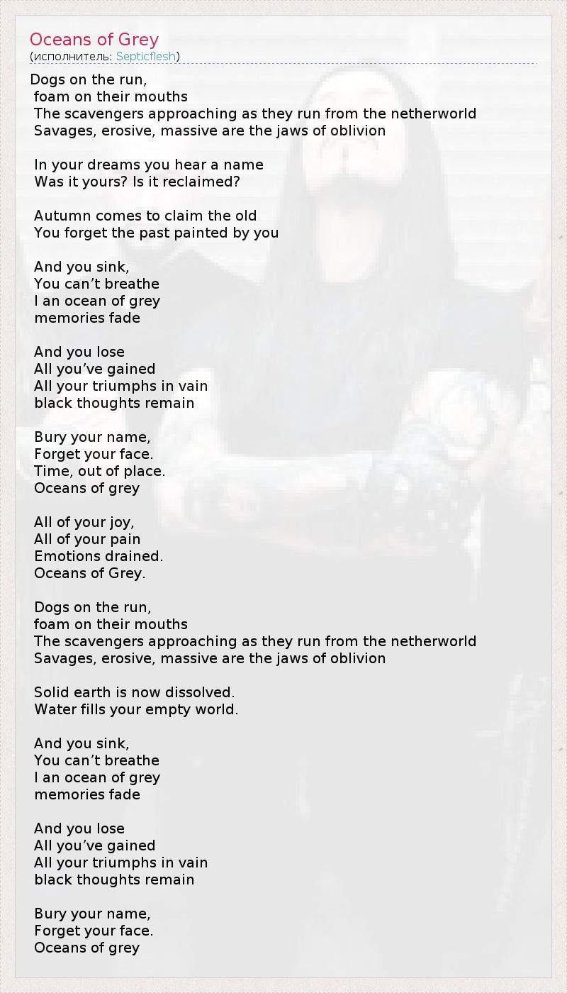 Собаки в бегах , пены на их устах В мусорщики приближается , поскольку они идут из преисподней Дикари , эрозивно , массивная являются челюсти забвения В вашей мечты Вы слышите название Было ли это твое? Будет утилизирован это ? Осень наступает претендовать старый Вы забыть прошлое , нарисованную вами И вы погружаетесь , Вы не можете дышать Я океан серый воспоминания исчезают И вы теряете Все вы получили Все ваши триумфы зря черные мысли остаются Бери свое имя, Забудьте свое лицо . Время , не к месту. Океаны серого Все ваши радости , Все ваши боли Эмоции исчерпан. Океаны серый. Собаки в бегах , пены на их устах В мусорщики приближается , поскольку они идут из преисподней Дикари , эрозивно , массивная являются челюсти забвения Твердые земля теперь распущена. Вода наполняет пустой мир . И вы погружаетесь , Вы не можете дышать Я океан серый воспоминания исчезают И вы теряете Все вы получили Все ваши триумфы зря черные мысли остаются Бери свое имя, Забудьте свое лицо . Океаны серого