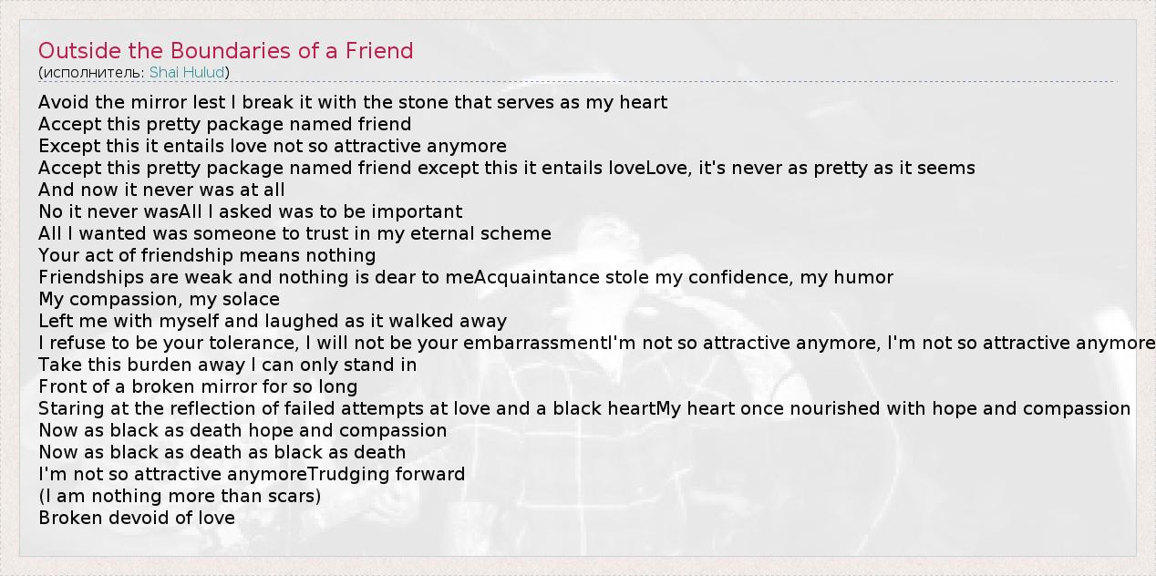 А как ты думаешь, о чем песня "Outside the Boundaries of a Friend" ?