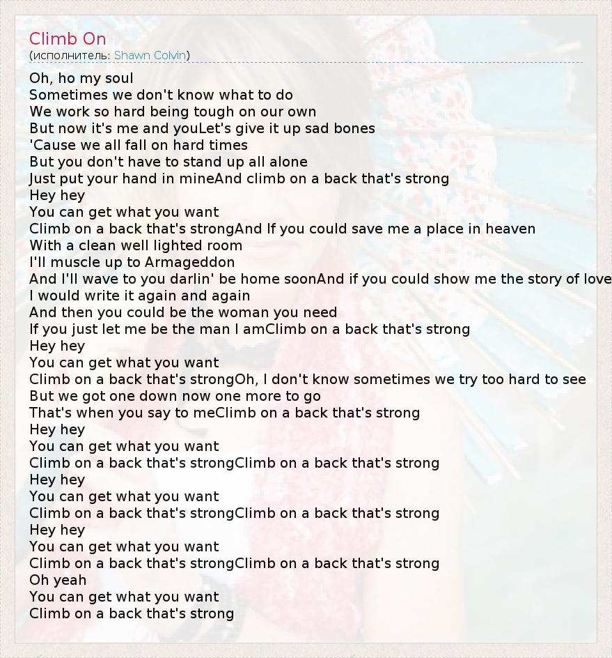 Oh, ho my soul Sometimes we don't know what to do We work so hard being tough on our own But now it's me and youLet's give it up sad bones 'Cause we all fall on hard times But you don't have to stand up all alone Just put your hand in mineAnd climb on a back that's strong Hey hey You can get what you want Climb on a back that's strongAnd If you could save me a place in heaven With a clean well lighted room I'll muscle up to Armageddon And I'll wave to you darlin' be home soonAnd if you could show me the story of love I would write it again and again And then you could be the woman you need If you just let me be the man I amClimb on a back that's strong Hey hey You can get what you want Climb on a back that's strongOh, I don't know sometimes we try too hard to see But we got one down now one more to go That's when you say to meClimb on a back that's strong Hey hey You can get what you want Climb on a back that's strongClimb on a back that's strong Hey hey You can get what you want Climb on a back that's strongClimb on a back that's strong Hey hey You can get what you want Climb on a back that's strongClimb on a back that's strong Oh yeah You can get what you want Climb on a back that's strong