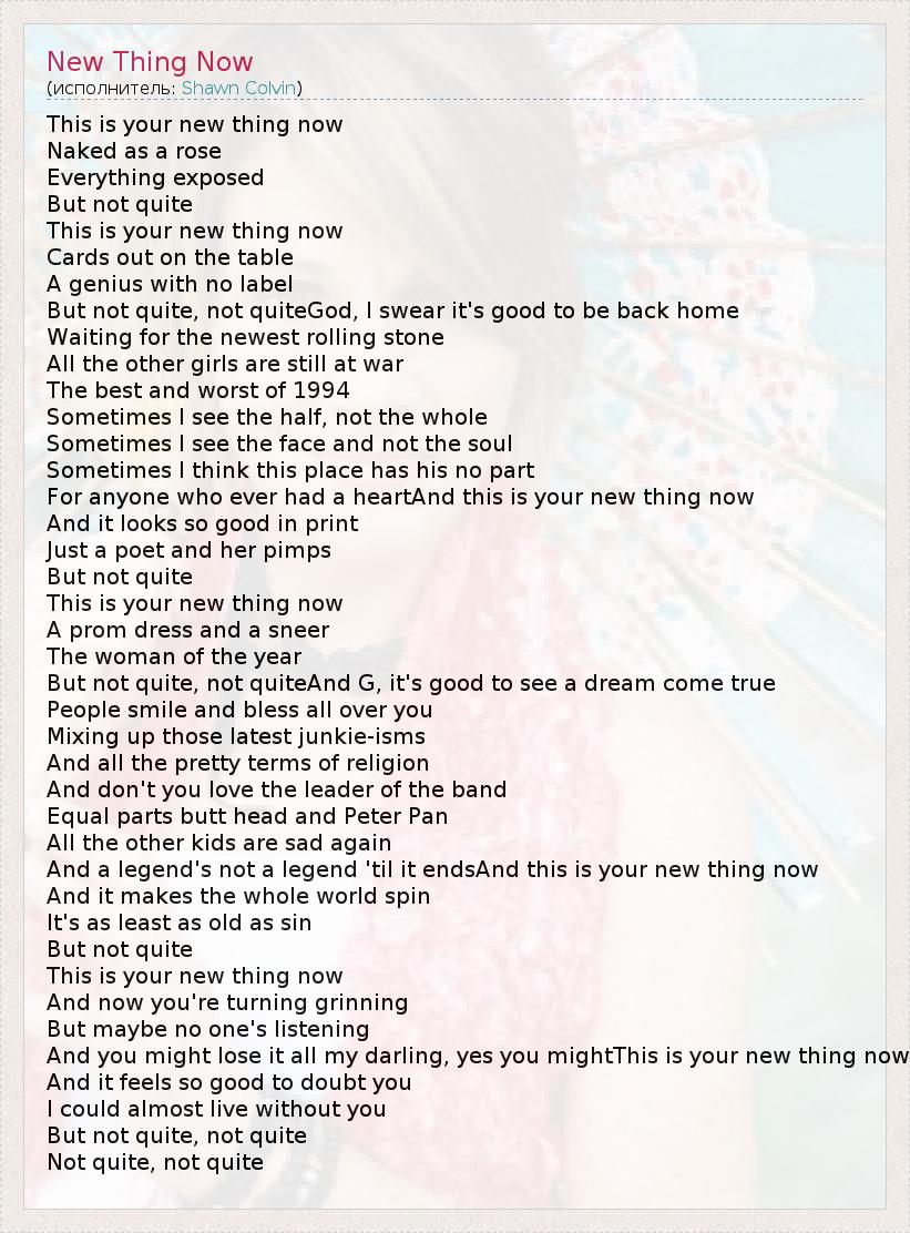 This is your new thing now Naked as a rose Everything exposed But not quite This is your new thing now Cards out on the table A genius with no label But not quite, not quiteGod, I swear it's good to be back home Waiting for the newest rolling stone All the other girls are still at war The best and worst of 1994 Sometimes I see the half, not the whole Sometimes I see the face and not the soul Sometimes I think this place has his no part For anyone who ever had a heartAnd this is your new thing now And it looks so good in print Just a poet and her pimps But not quite This is your new thing now A prom dress and a sneer The woman of the year But not quite, not quiteAnd G, it's good to see a dream come true People smile and bless all over you Mixing up those latest junkie-isms And all the pretty terms of religion And don't you love the leader of the band Equal parts butt head and Peter Pan All the other kids are sad again And a legend's not a legend 'til it endsAnd this is your new thing now And it makes the whole world spin It's as least as old as sin But not quite This is your new thing now And now you're turning grinning But maybe no one's listening And you might lose it all my darling, yes you mightThis is your new thing now And it feels so good to doubt you I could almost live without you But not quite, not quite Not quite, not quite