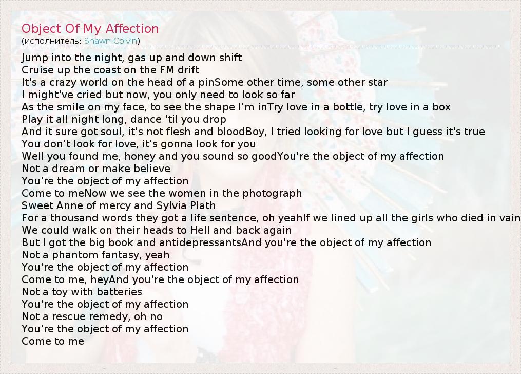 Jump into the night, gas up and down shift Cruise up the coast on the FM drift It's a crazy world on the head of a pinSome other time, some other star I might've cried but now, you only need to look so far As the smile on my face, to see the shape I'm inTry love in a bottle, try love in a box Play it all night long, dance 'til you drop And it sure got soul, it's not flesh and bloodBoy, I tried looking for love but I guess it's true You don't look for love, it's gonna look for you Well you found me, honey and you sound so goodYou're the object of my affection Not a dream or make believe You're the object of my affection Come to meNow we see the women in the photograph Sweet Anne of mercy and Sylvia Plath For a thousand words they got a life sentence, oh yeahIf we lined up all the girls who died in vain We could walk on their heads to Hell and back again But I got the big book and antidepressantsAnd you're the object of my affection Not a phantom fantasy, yeah You're the object of my affection Come to me, heyAnd you're the object of my affection Not a toy with batteries You're the object of my affection Not a rescue remedy, oh no You're the object of my affection Come to me