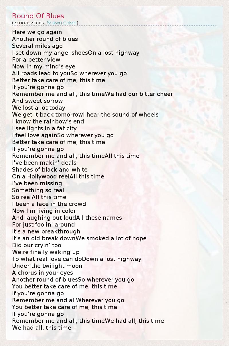 Here we go again Another round of blues Several miles ago I set down my angel shoesOn a lost highway For a better view Now in my mind's eye All roads lead to youSo wherever you go Better take care of me, this time If you're gonna go Remember me and all, this timeWe had our bitter cheer And sweet sorrow We lost a lot today We get it back tomorrowI hear the sound of wheels I know the rainbow's end I see lights in a fat city I feel love againSo wherever you go Better take care of me, this time If you're gonna go Remember me and all, this timeAll this time I've been makin' deals Shades of black and white On a Hollywood reelAll this time I've been missing Something so real So realAll this time I been a face in the crowd Now I'm living in color And laughing out loudAll these names For just foolin' around It's a new breakthrough It's an old break downWe smoked a lot of hope Did our cryin' too We're finally waking up To what real love can doDown a lost highway Under the twilight moon A chorus in your eyes Another round of bluesSo wherever you go You better take care of me, this time If you're gonna go Remember me and allWherever you go You better take care of me, this time If you're gonna go Remember me and all, this timeWe had all, this time We had all, this time