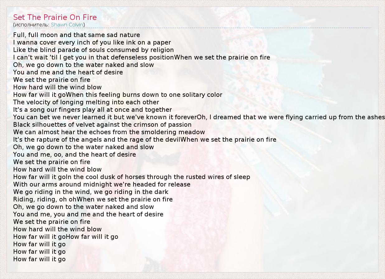 Full, full moon and that same sad nature I wanna cover every inch of you like ink on a paper Like the blind parade of souls consumed by religion I can't wait 'til I get you in that defenseless positionWhen we set the prairie on fire Oh, we go down to the water naked and slow You and me and the heart of desire We set the prairie on fire How hard will the wind blow How far will it goWhen this feeling burns down to one solitary color The velocity of longing melting into each other It's a song our fingers play all at once and together You can bet we never learned it but we've known it foreverOh, I dreamed that we were flying carried up from the ashes Black silhouettes of velvet against the crimson of passion We can almost hear the echoes from the smoldering meadow It's the rapture of the angels and the rage of the devilWhen we set the prairie on fire Oh, we go down to the water naked and slow You and me, oo, and the heart of desire We set the prairie on fire How hard will the wind blow How far will it goIn the cool dusk of horses through the rusted wires of sleep With our arms around midnight we're headed for release We go riding in the wind, we go riding in the dark Riding, riding, oh ohWhen we set the prairie on fire Oh, we go down to the water naked and slow You and me, you and me and the heart of desire We set the prairie on fire How hard will the wind blow How far will it goHow far will it go How far will it go How far will it go How far will it go