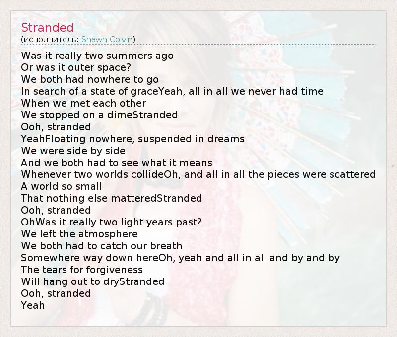 Was it really two summers ago Or was it outer space? We both had nowhere to go In search of a state of graceYeah, all in all we never had time When we met each other We stopped on a dimeStranded Ooh, stranded YeahFloating nowhere, suspended in dreams We were side by side And we both had to see what it means Whenever two worlds collideOh, and all in all the pieces were scattered A world so small That nothing else matteredStranded Ooh, stranded OhWas it really two light years past? We left the atmosphere We both had to catch our breath Somewhere way down hereOh, yeah and all in all and by and by The tears for forgiveness Will hang out to dryStranded Ooh, stranded Yeah