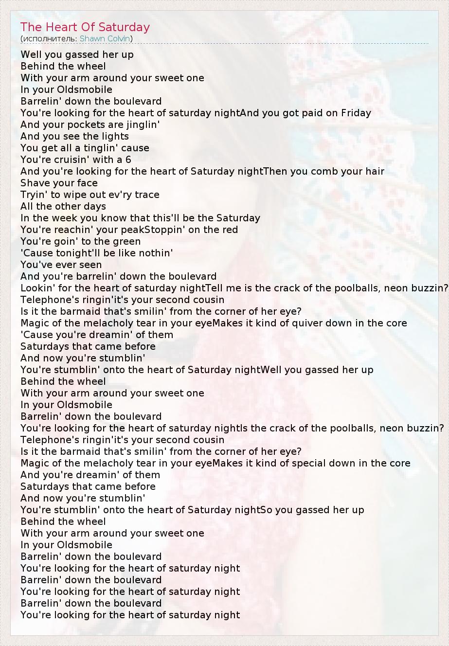 Well you gassed her up Behind the wheel With your arm around your sweet one In your Oldsmobile Barrelin' down the boulevard You're looking for the heart of saturday nightAnd you got paid on Friday And your pockets are jinglin' And you see the lights You get all a tinglin' cause You're cruisin' with a 6 And you're looking for the heart of Saturday nightThen you comb your hair Shave your face Tryin' to wipe out ev'ry trace All the other days In the week you know that this'll be the Saturday You're reachin' your peakStoppin' on the red You're goin' to the green 'Cause tonight'll be like nothin' You've ever seen And you're barrelin' down the boulevard Lookin' for the heart of saturday nightTell me is the crack of the poolballs, neon buzzin? Telephone's ringin'it's your second cousin Is it the barmaid that's smilin' from the corner of her eye? Magic of the melacholy tear in your eyeMakes it kind of quiver down in the core 'Cause you're dreamin' of them Saturdays that came before And now you're stumblin' You're stumblin' onto the heart of Saturday nightWell you gassed her up Behind the wheel With your arm around your sweet one In your Oldsmobile Barrelin' down the boulevard You're looking for the heart of saturday nightIs the crack of the poolballs, neon buzzin? Telephone's ringin'it's your second cousin Is it the barmaid that's smilin' from the corner of her eye? Magic of the melacholy tear in your eyeMakes it kind of special down in the core And you're dreamin' of them Saturdays that came before And now you're stumblin' You're stumblin' onto the heart of Saturday nightSo you gassed her up Behind the wheel With your arm around your sweet one In your Oldsmobile Barrelin' down the boulevard You're looking for the heart of saturday night Barrelin' down the boulevard You're looking for the heart of saturday night Barrelin' down the boulevard You're looking for the heart of saturday night