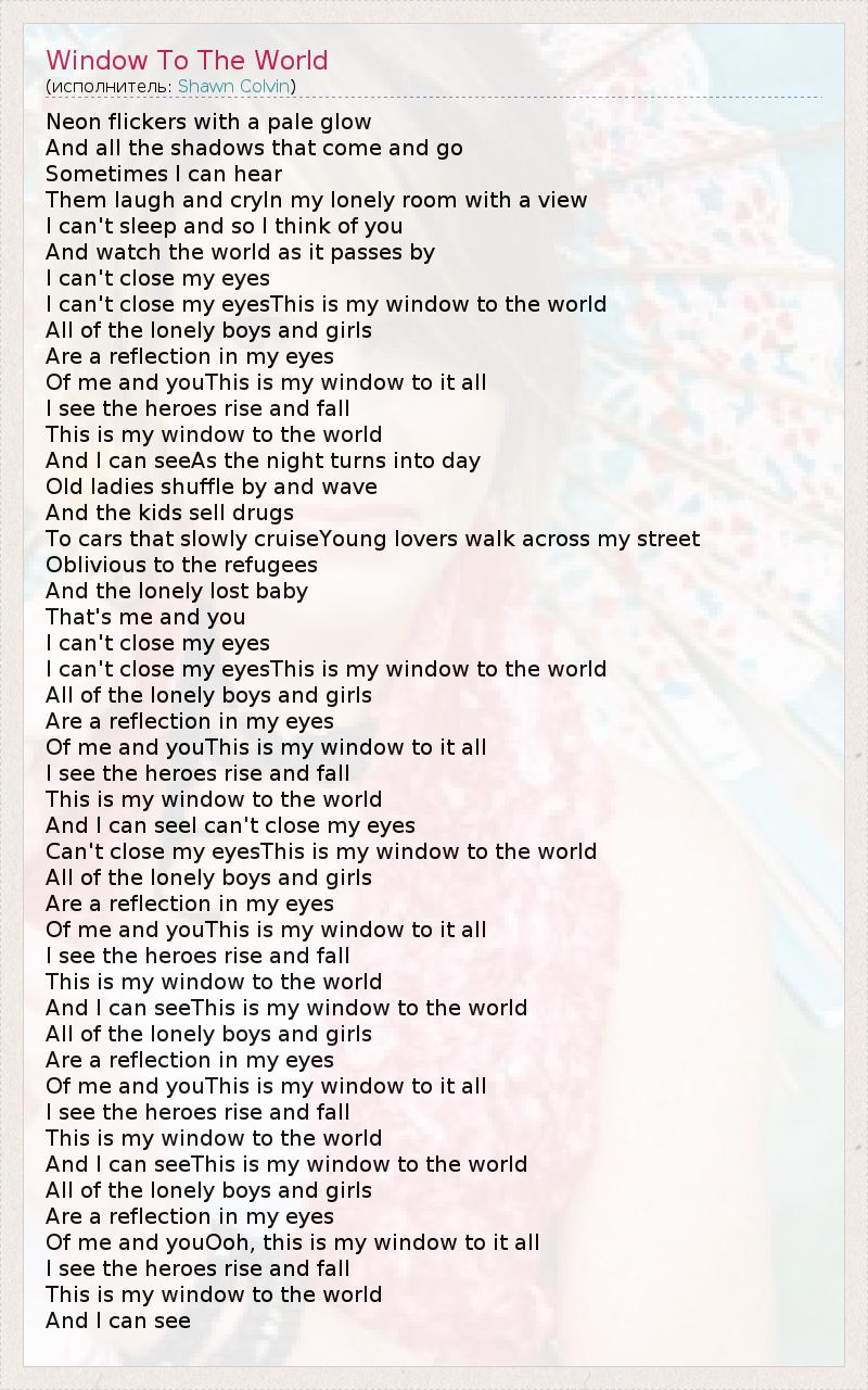 Neon flickers with a pale glow And all the shadows that come and go Sometimes I can hear Them laugh and cryIn my lonely room with a view I can't sleep and so I think of you And watch the world as it passes by I can't close my eyes I can't close my eyesThis is my window to the world All of the lonely boys and girls Are a reflection in my eyes Of me and youThis is my window to it all I see the heroes rise and fall This is my window to the world And I can seeAs the night turns into day Old ladies shuffle by and wave And the kids sell drugs To cars that slowly cruiseYoung lovers walk across my street Oblivious to the refugees And the lonely lost baby That's me and you I can't close my eyes I can't close my eyesThis is my window to the world All of the lonely boys and girls Are a reflection in my eyes Of me and youThis is my window to it all I see the heroes rise and fall This is my window to the world And I can seeI can't close my eyes Can't close my eyesThis is my window to the world All of the lonely boys and girls Are a reflection in my eyes Of me and youThis is my window to it all I see the heroes rise and fall This is my window to the world And I can seeThis is my window to the world All of the lonely boys and girls Are a reflection in my eyes Of me and youThis is my window to it all I see the heroes rise and fall This is my window to the world And I can seeThis is my window to the world All of the lonely boys and girls Are a reflection in my eyes Of me and youOoh, this is my window to it all I see the heroes rise and fall This is my window to the world And I can see