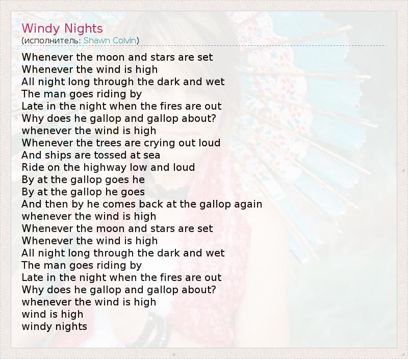 Whenever the moon and stars are set Whenever the wind is high All night long through the dark and wet The man goes riding by Late in the night when the fires are out Why does he gallop and gallop about? whenever the wind is high Whenever the trees are crying out loud And ships are tossed at sea Ride on the highway low and loud By at the gallop goes he By at the gallop he goes And then by he comes back at the gallop again whenever the wind is high Whenever the moon and stars are set Whenever the wind is high All night long through the dark and wet The man goes riding by Late in the night when the fires are out Why does he gallop and gallop about? whenever the wind is high wind is high windy nights