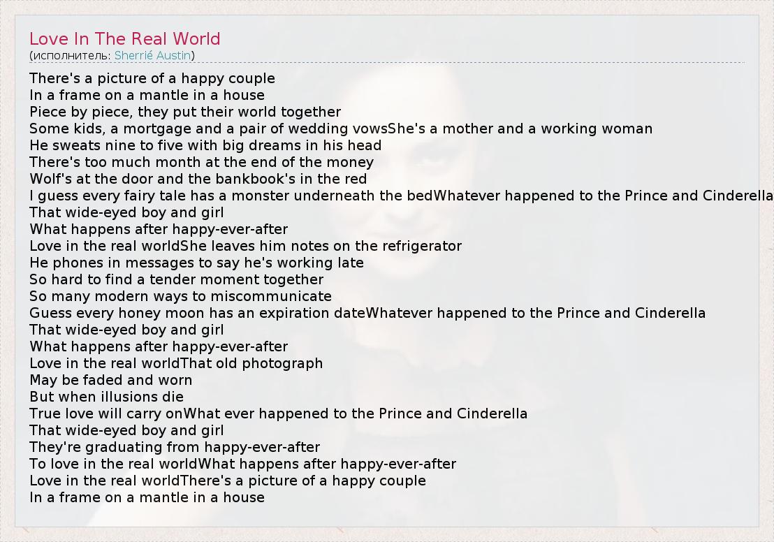 There's a picture of a happy couple In a frame on a mantle in a house Piece by piece, they put their world together Some kids, a mortgage and a pair of wedding vowsShe's a mother and a working woman He sweats nine to five with big dreams in his head There's too much month at the end of the money Wolf's at the door and the bankbook's in the red I guess every fairy tale has a monster underneath the bedWhatever happened to the Prince and Cinderella That wide-eyed boy and girl What happens after happy-ever-after Love in the real worldShe leaves him notes on the refrigerator He phones in messages to say he's working late So hard to find a tender moment together So many modern ways to miscommunicate Guess every honey moon has an expiration dateWhatever happened to the Prince and Cinderella That wide-eyed boy and girl What happens after happy-ever-after Love in the real worldThat old photograph May be faded and worn But when illusions die True love will carry onWhat ever happened to the Prince and Cinderella That wide-eyed boy and girl They're graduating from happy-ever-after To love in the real worldWhat happens after happy-ever-after Love in the real worldThere's a picture of a happy couple In a frame on a mantle in a house