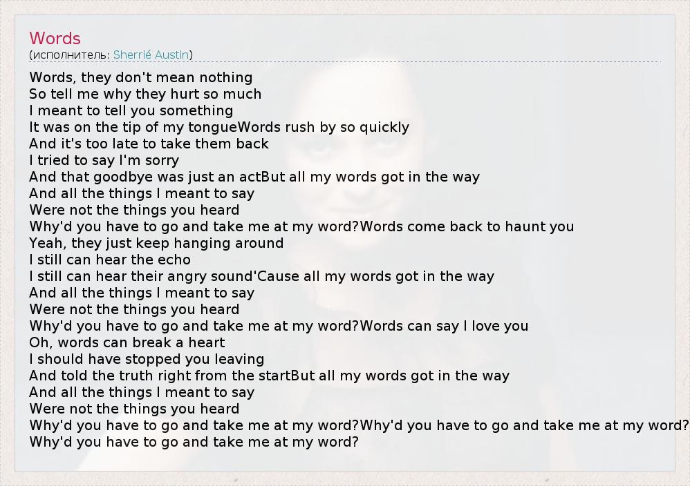 Words, they don't mean nothing So tell me why they hurt so much I meant to tell you something It was on the tip of my tongueWords rush by so quickly And it's too late to take them back I tried to say I'm sorry And that goodbye was just an actBut all my words got in the way And all the things I meant to say Were not the things you heard Why'd you have to go and take me at my word?Words come back to haunt you Yeah, they just keep hanging around I still can hear the echo I still can hear their angry sound'Cause all my words got in the way And all the things I meant to say Were not the things you heard Why'd you have to go and take me at my word?Words can say I love you Oh, words can break a heart I should have stopped you leaving And told the truth right from the startBut all my words got in the way And all the things I meant to say Were not the things you heard Why'd you have to go and take me at my word?Why'd you have to go and take me at my word? Why'd you have to go and take me at my word?
