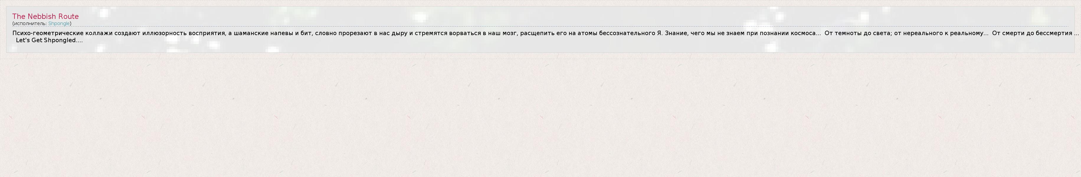 Это интересно:Shpongle (Шпонгл) — популярный британский электронный музыкальный проект, образованный в 1996 году, работающий в направлении психоделического даунтемпо (оно же psybient)Участники дуэта — Саймон Посфорд (Simon Posford, также известный как Hallucinogen, и участник проекта Younger Brother) и Раджа Рам (Raja Ram, участник проектов The Infinity Project, 1200 Micrograms и др.). Звук проекта сочетает в себе этнические семплы, живые инструменты,... продолжение