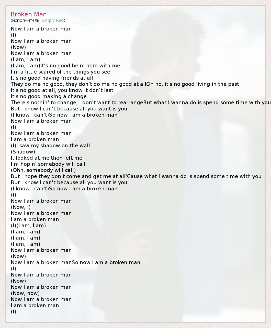 Now I am a broken man (I) Now I am a broken man (Now) Now I am a broken man (I am, I am) (I am, I am)It's no good bein' here with me I'm a little scared of the things you see It's no good having friends at all They do me no good, they don't do me no good at allOh ho, it's no good living in the past It's no good at all, you know it don't last It's no good making a change There's nothin' to change, I don't want to rearrangeBut what I wanna do is spend some time with you But I know I can't because all you want is you (I know I can't)So now I am a broken man Now I am a broken man (I) Now I am a broken man I am a broken man (I)I saw my shadow on the wall (Shadow) It looked at me then left me I'm hopin' somebody will call (Ohh, somebody will call) But I hope they don't come and get me at all'Cause what I wanna do is spend some time with you But I know I can't because all you want is you (I know I can't)So now I am a broken man (I) Now I am a broken man (Now, I) Now I am a broken man I am a broken man (I)(I am, I am) (I am, I am) (I am, I am) (I am, I am) Now I am a broken man (Now) Now I am a broken manSo now I am a broken man (I) Now I am a broken man (Now) Now I am a broken man (Now, now) Now I am a broken man I am a broken man (I)
