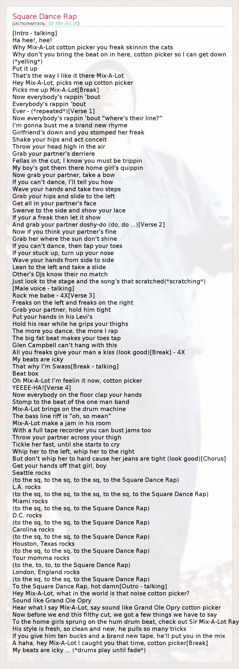 [Intro - talking] Ha hee!, hee! Why Mix-A-Lot cotton picker you freak skinnin the cats Why don't you bring the beat on in here, cotton picker so I can get down (*yelling*) Put it up That's the way I like it there Mix-A-Lot Hey Mix-A-Lot, picks me up cotton picker Picks me up Mix-A-Lot[Break] Now everybody's rappin 'bout Everybody's rappin 'bout Ever - (*repeated*)[Verse 1] Now everybody's rappin 'bout "where's their line?" I'm gonna bust me a brand new rhyme Girlfriend's down and you stomped her freak Shake your hips and act conceit Throw your head high in the air Grab your partner's derriere Fellas in the cut, I know you must be trippin My boy's got them there home girl's quippin Now grab your partner, take a bow If you can't dance, I'll tell you how Wave your hands and take two steps Grab your hips and slide to the left Get all in your partner's face Swerve to the side and show your lace If your a freak then let it show And grab your partner doshy-do (do, do ...)[Verse 2] Now if you think your partner's fine Grab her where the sun don't shine If you can't dance, then tap your toes If your stuck up, turn up your nose Wave your hands from side to side Lean to the left and take a slide Other's DJs know their no match Just look to the stage and the song's that scratched(*scratching*) [Male voice - talking] Rock me babe - 4X[Verse 3] Freaks on the left and freaks on the right Grab your partner, hold him tight Put your hands in his Levi's Hold his rear while he grips your thighs The more you dance, the more I rap The big fat beat makes your toes tap Glen Campbell can't hang with this All you freaks give your man a kiss (look good)[Break] - 4X My beats are icky That why I'm Swass[Break - talking] Beat box Oh Mix-A-Lot I'm feelin it now, cotton picker YEEEE-HA![Verse 4] Now everybody on the floor clap your hands Stomp to the beat of the one man band Mix-A-Lot brings on the drum machine The bass line riff is "oh, so mean" Mix-A-Lot make a jam in his room With a full tape recorder you can bust jams too Throw your partner across your thigh Tickle her fast, until she starts to cry Whip her to the left, whip her to the right But don't whip her to hard cause her jeans are tight (look good)[Chorus] Get your hands off that girl, boy Seattle rocks (to the sq, to the sq, to the sq, to the Square Dance Rap) L.A. rocks (to the sq, to the sq, to the sq, to the sq, to the Square Dance Rap) Miami rocks (to the sq, to the sq, to the Square Dance Rap) D.C. rocks (to the sq, to the sq, to the Square Dance Rap) Carolina rocks (to the sq, to the sq, to the Square Dance Rap) Houston, Texas rocks (to the sq, to the sq, to the Square Dance Rap) Your momma rocks (to the, to, to, to the Square Dance Rap) London, England rocks (to the sq, to the sq, to the Square Dance Rap) To the Square Dance Rap, hot damn[Outro - talking] Hey Mix-A-Lot, what in the world is that noise cotton picker? Sound like Grand Ole Opry Hear what I say Mix-A-Lot, say sound like Grand Ole Opry cotton picker Now before we end this filthy cut, we got a few things we have to say To the home girls sprung on the hum drum beat, check out Sir Mix-A-Lot Ray His style is fresh, so clean and new, he pulls so many tricks If you give him ten bucks and a brand new tape, he'll put you in the mix A haha, hey Mix-A-Lot I caught you that time, cotton picker[Break] My beats are icky ... (*drums play until fade*)