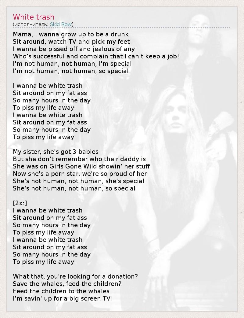 Мама, я хочу вырасти, чтобы стать пьяницей, Сидеть без дела, смотреть телевизор, поджав ноги. Я хочу быть несчастным и завидовать любому, Кто удачлив, и жаловаться, что не могу удержаться на работе! Я не человек, не человек, я особенный, Я не человек, не человек, такой особенный. Я хочу быть белой швалью, И сидеть без дела на своей жирной зад**це Часами, Чтобы проср*ть свою жизнь. Я хочу быть белой швалью, И сидеть без дела на своей жирной зад**це Часами, Чтобы проср*ть свою жизнь. У моей сестры 3 младенца, Но она не помнит, кто их папочка. Она снялась в Girls Gone Wild и показала свои прелести. Теперь она - порнозвезда, мы так гордимся ею. Она не человек, не человек, она особенная, Она не человек, не человек, такая особенная. [2x:] Я хочу быть белой швалью, И сидеть без дела на своей жирной зад**це Часами, Чтобы проср*ть свою жизнь. Я хочу быть белой швалью, И сидеть без дела на своей жирной зад**це Часами, Чтобы проср*ть свою жизнь. Что это, вы надеетесь на пожертвование? Спасаете китов, кормите детей? Скормите детей китам, А я коплю на широкоформатный телевизор!