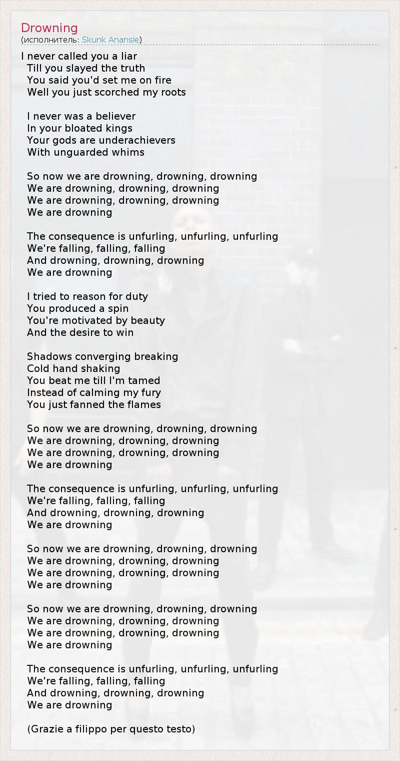 I never called you a liar Till you slayed the truth You said you'd set me on fire Well you just scorched my roots I never was a believer In your bloated kings Your gods are underachievers With unguarded whims So now we are drowning, drowning, drowning We are drowning, drowning, drowning We are drowning, drowning, drowning We are drowning The consequence is unfurling, unfurling, unfurling We're falling, falling, falling And drowning, drowning, drowning We are drowning I tried to reason for duty You produced a spin You're motivated by beauty And the desire to win Shadows converging breaking Cold hand shaking You beat me till I'm tamed Instead of calming my fury You just fanned the flames So now we are drowning, drowning, drowning We are drowning, drowning, drowning We are drowning, drowning, drowning We are drowning The consequence is unfurling, unfurling, unfurling We're falling, falling, falling And drowning, drowning, drowning We are drowning So now we are drowning, drowning, drowning We are drowning, drowning, drowning We are drowning, drowning, drowning We are drowning So now we are drowning, drowning, drowning We are drowning, drowning, drowning We are drowning, drowning, drowning We are drowning The consequence is unfurling, unfurling, unfurling We're falling, falling, falling And drowning, drowning, drowning We are drowning (Grazie a filippo per questo testo)