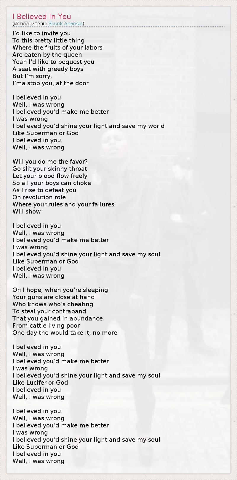 Я хотел бы пригласить вас Для этого довольно небольшой вещи Где плоды ваших трудов Поедаются королевы Да, я бы хотел , чтобы по завещанию вас Сиденье с жадными мальчиков Но мне очень жаль , I'ma остановить вас , у двери Я верил в тебя Ну , я был неправ Я верил вы делаете меня лучше Я был неправ Я верил ты светить свой свет и сохранить свой мир Как Супермена или Бога Я верил в тебя Ну , я был неправ Будете ли вы сделать мне одолжение ? Перейти перерезать тебе горло тощий Пусть ваш кровоток свободно Таким образом, все ваши мальчики могут задохнуться Как я встаю , чтобы победить вас О роли революции Где ваши правила и ваши неудачи покажет Я верил в тебя Ну , я был неправ Я верил вы делаете меня лучше Я был неправ Я верил ты светить свой свет и спасти мою душу Как Супермена или Бога Я верил в тебя Ну , я был неправ О, я надеюсь, что , когда вы спите Ваши пушки находятся под рукой Кто знает, кто обманывает Чтобы украсть вашу контрабанду То, что вы получили в изобилии От крупного рогатого скота , живущих бедных Не один деньвзял бы его , не более Я верил в тебя Ну , я был неправ Я верил вы делаете меня лучше Я был неправ Я верил ты светить свой свет и спасти мою душу Как Люцифера или Бога Я верил в тебя Ну , я был неправ Я верил в тебя Ну , я был неправ Я верил вы делаете меня лучше Я был неправ Я верил ты светить свой свет и спасти мою душу Как Супермена или Бога Я верил в тебя Ну , я был неправ