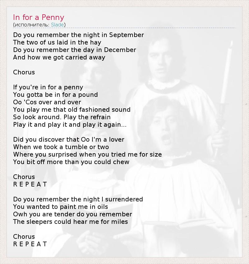 Do you remember the night in September The two of us laid in the hay Do you remember the day in December And how we got carried away Chorus If you're in for a penny You gotta be in for a pound Oo 'Cos over and over You play me that old fashioned sound So look around. Play the refrain Play it and play it and play it again... Did you discover that Oo I'm a lover When we took a tumble or two Where you surprised when you tried me for size You bit off more than you could chew Chorus R E P E A T Do you remember the night I surrendered You wanted to paint me in oils Owh you are tender do you remember The sleepers could hear me for miles Chorus R E P E A T