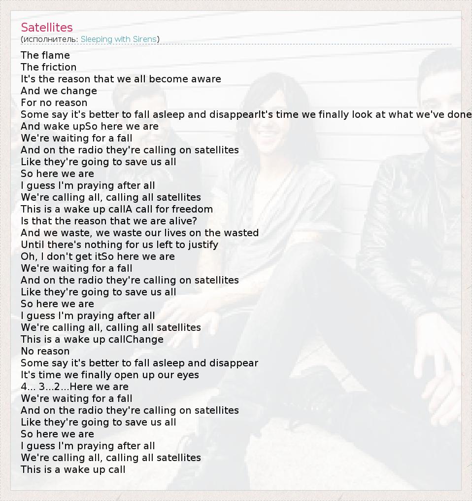 The flame The friction It's the reason that we all become aware And we change For no reason Some say it's better to fall asleep and disappearIt's time we finally look at what we've done And wake upSo here we are We're waiting for a fall And on the radio they're calling on satellites Like they're going to save us all So here we are I guess I'm praying after all We're calling all, calling all satellites This is a wake up callA call for freedom Is that the reason that we are alive? And we waste, we waste our lives on the wasted Until there's nothing for us left to justify Oh, I don't get itSo here we are We're waiting for a fall And on the radio they're calling on satellites Like they're going to save us all So here we are I guess I'm praying after all We're calling all, calling all satellites This is a wake up callChange No reason Some say it's better to fall asleep and disappear It's time we finally open up our eyes 4... 3...2...Here we are We're waiting for a fall And on the radio they're calling on satellites Like they're going to save us all So here we are I guess I'm praying after all We're calling all, calling all satellites This is a wake up call