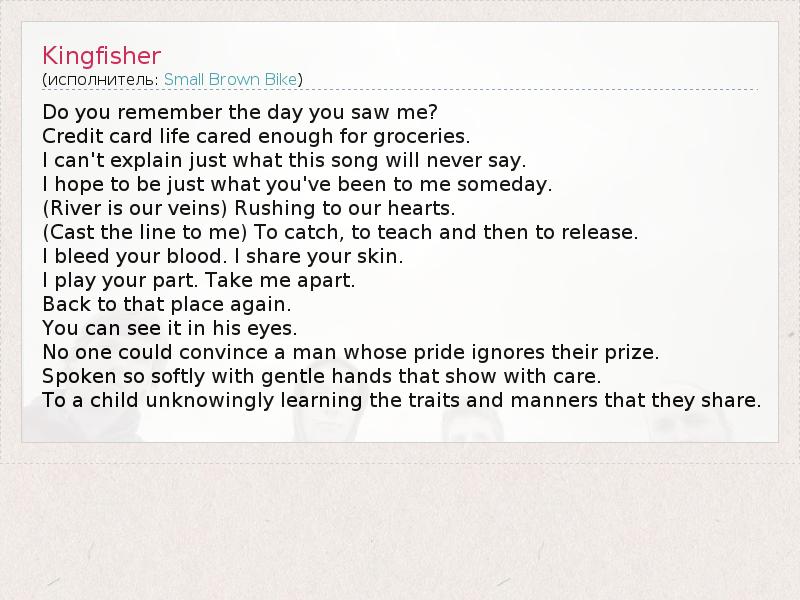 А как ты думаешь, о чем песня "Kingfisher" ?