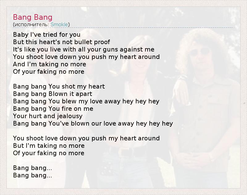 Baby I've tried for you But this heart's not bullet proof It's like you live with all your guns against me You shoot love down you push my heart around And I'm taking no more Of your faking no more Bang bang You shot my heart Bang bang Blown it apart Bang bang You blew my love away hey hey hey Bang bang You fire on me Your hurt and jealousy Bang bang You've blown our love away hey hey hey You shoot love down you push my heart around But I'm taking no more Of your faking no more Bang bang... Bang bang...