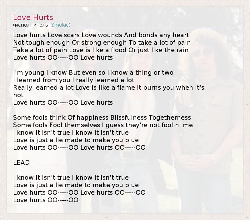 Любовь болит Любовь шрамы Любовь раны и облигации любое сердце Не достаточно жестким Или достаточно сильны, чтобы взять много боли Возьмите много боли Любовь как наводнение Или просто как дождь Любовь болит OO OO ----- Любовь болит Я молод, я знаю, но даже в этом случае я знаю вещь или два Я узнал от вас, я действительно многому научился Действительно узнал много Любовь как пламя Он сжигает вас, когда это горячая Любовь болит OO OO ----- Любовь болит Некоторые глупцы думают счастья блаженство единения Некоторые дураки обманывают себя я предполагаю, что они не Foolin ' меня Я знаю, что это не правда, я знаю, что это не соответствует действительности Любовь просто ложь сделали , чтобы вы синий Любовь болит OO OO ----- Любовь болит ОО ----- OO LEAD Я знаю, что это не правда, я знаю, что это не соответствует действительности Любовь просто ложь сделали , чтобы вы синий Любовь болит OO OO ----- Любовь болит ОО ----- OO Любовь болит ОО ----- OO