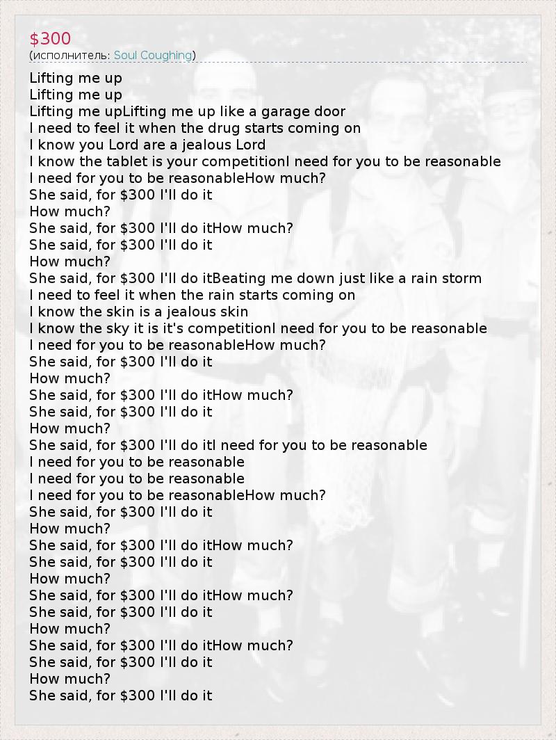 She said, for $300 I'll do itBeating me down just like a rain storm