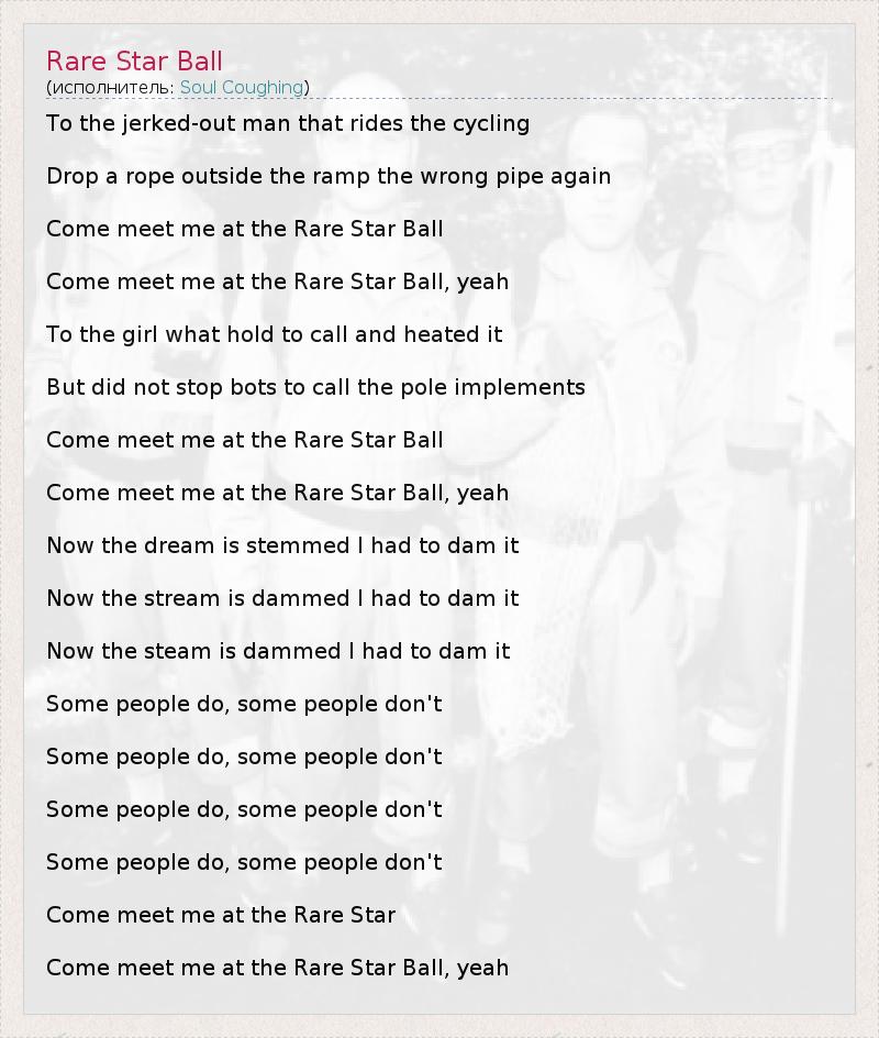 To the jerked-out man that rides the cycling Drop a rope outside the ramp the wrong pipe again Come meet me at the Rare Star Ball Come meet me at the Rare Star Ball, yeah To the girl what hold to call and heated it But did not stop bots to call the pole implements Come meet me at the Rare Star Ball Come meet me at the Rare Star Ball, yeah Now the dream is stemmed I had to dam it Now the stream is dammed I had to dam it Now the steam is dammed I had to dam it Some people do, some people don't Some people do, some people don't Some people do, some people don't Some people do, some people don't Come meet me at the Rare Star Come meet me at the Rare Star Ball, yeah